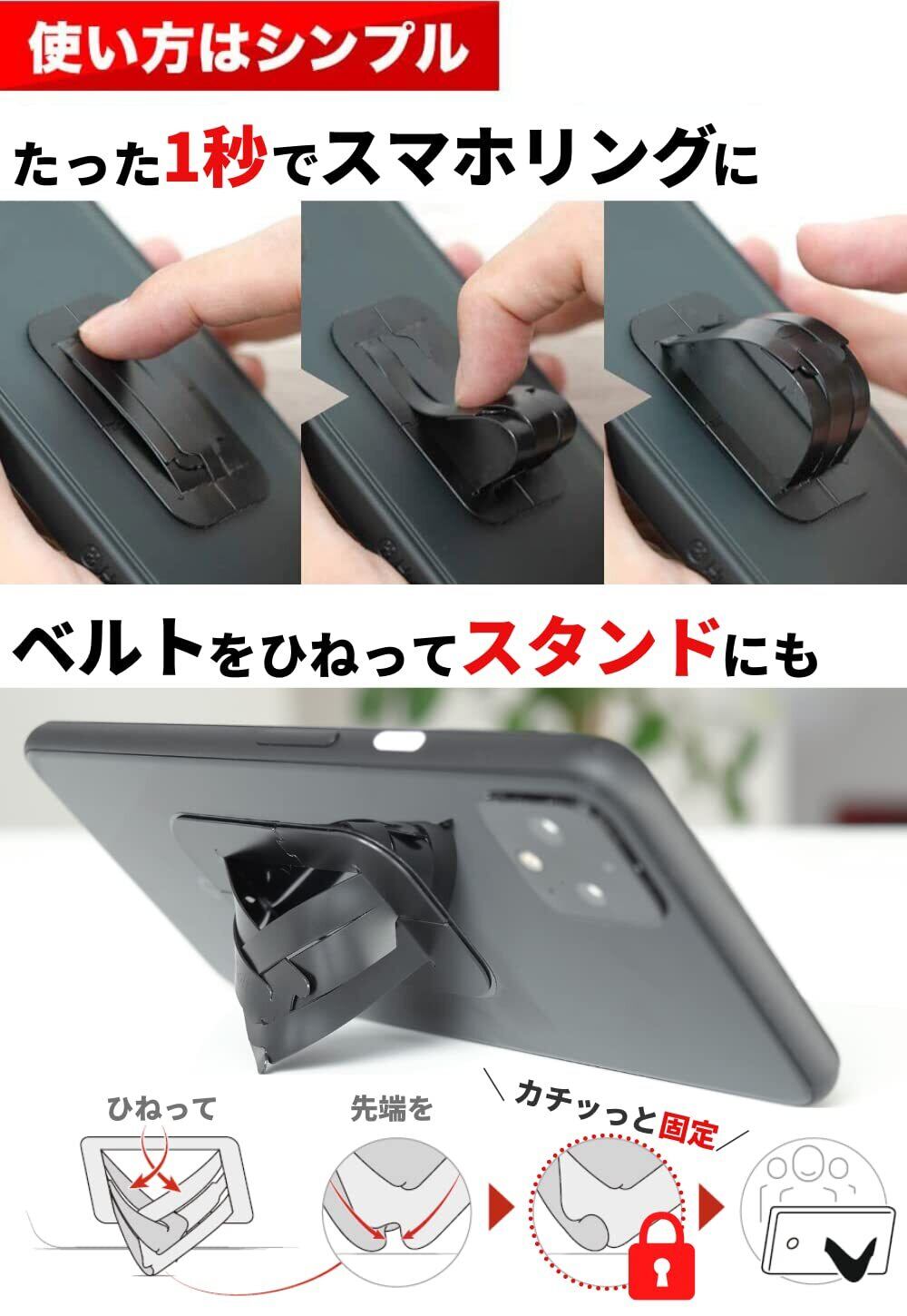 【スマホスタンドに変化】ベルトをひねるだけで実用的なスタンドに。2段階の角度でお好みの動画視聴を。1mmと薄いので車載ホルダー・スマホホルダーにもそのまま取付可能