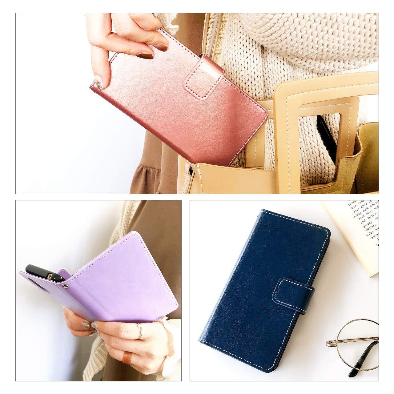 ストラップ穴付きのため、チェーンを付けたりストラップを付けることが可能となります。手帳の素材は合皮 PUレザーとなります。電源ボタン・音量ボタン等はケースの上から押す仕様となります。予めご了承ください。