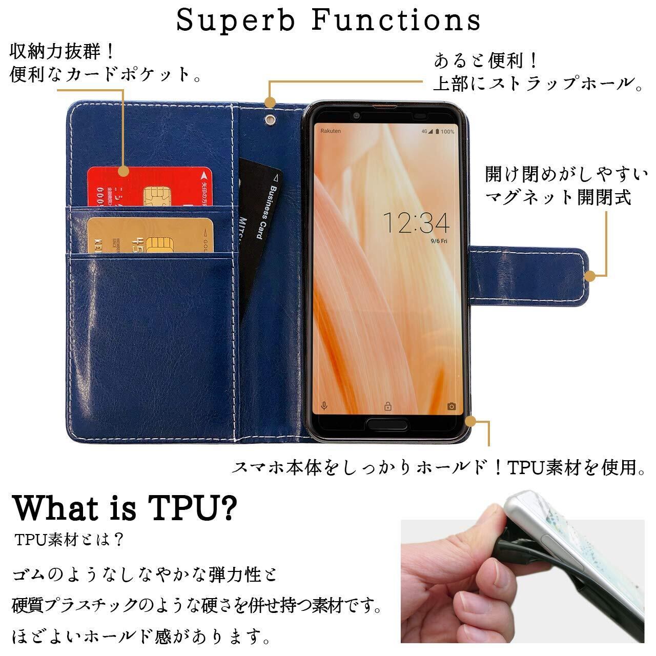 カードなどが収納できるポケット付きで、実用的な手帳型ケースです。手帳表面に特殊な加工を施してありますので細かい傷などがある場合がございます。予めご了承ください。