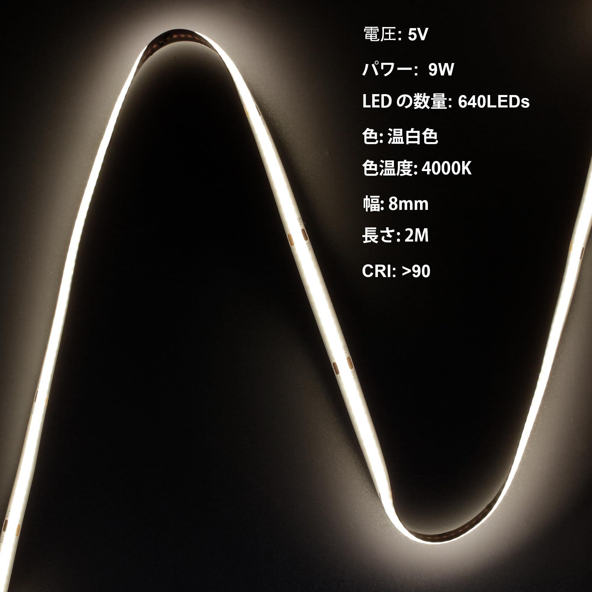 USB COB LEDテープライト2m 5V 温白色 4000K 高輝度 高密度 フレキシブル LEDテープライト および 切断可能 取付簡単 工具不要 非防水 店舗 室内 ホーム装飾用 DIY