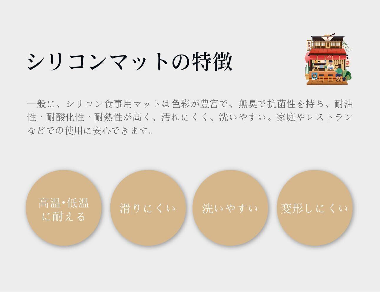 【安全・耐熱】 シリコン品質管理認証取得済みの100%食品級シリコン樹脂製です。BPAなどの有害成分を含まず、色あせしません。耐熱温度は-40℃~230℃で、高温の料理やスープから食卓を保護。耐熱性に優れ、鍋掴みとしても使用可能。安全無毒で環境にも優しい製品です。30日間の安心を提供しています。