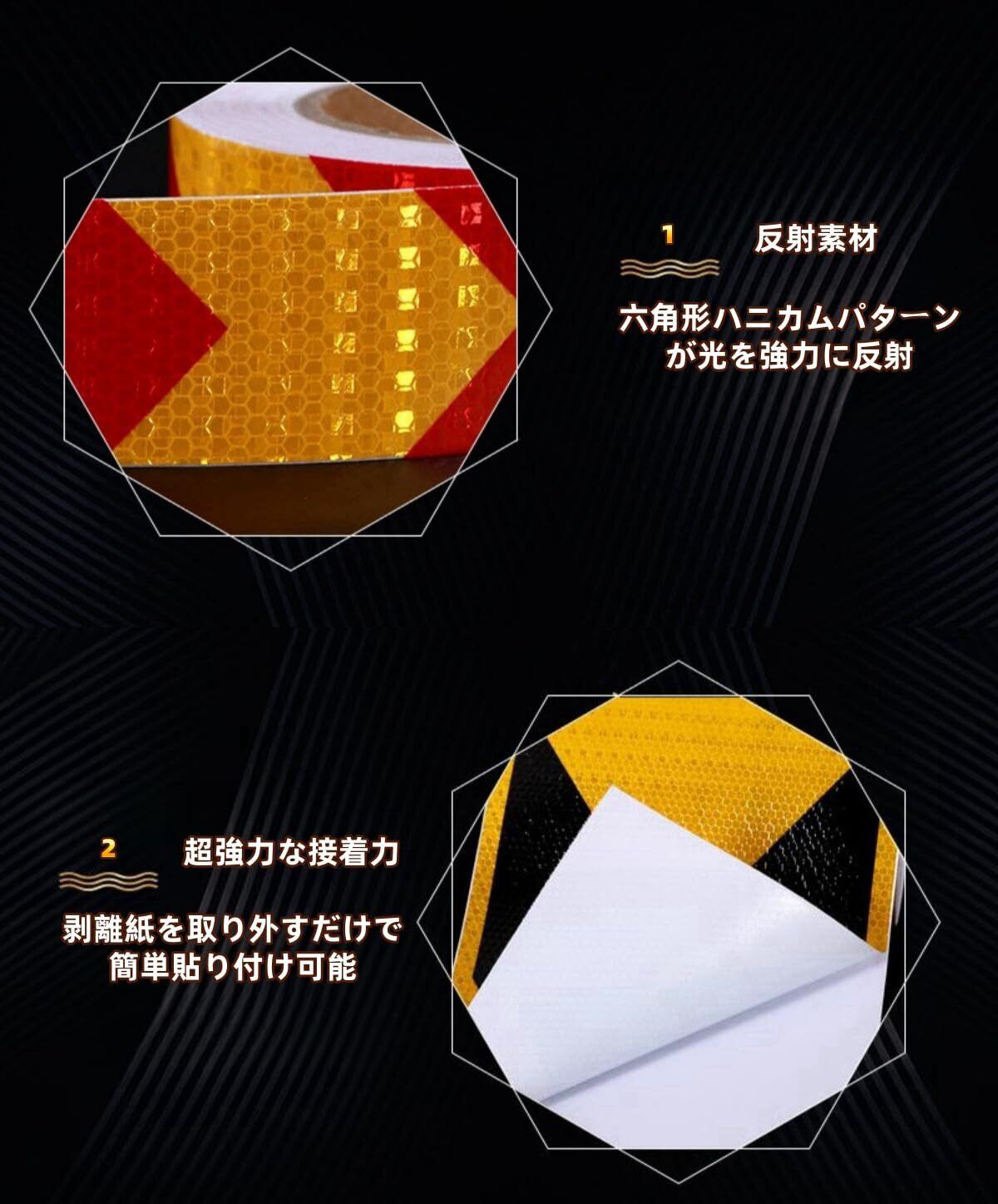 【安心の高輝度反射テープ】暗闇や夜間でも自分の存在をアピールし、安全に行動しましょう。ポリ塩化ビニールを採用したテープで、六角形ハニカムパターンが光を強力に反射します。車や自転車、かばんやランドセルに貼り、事故を未然に防ぎます。レジ前の仕切りや行列待ちにも活用でき、多目的に使用できる頼もしいアイテムです。