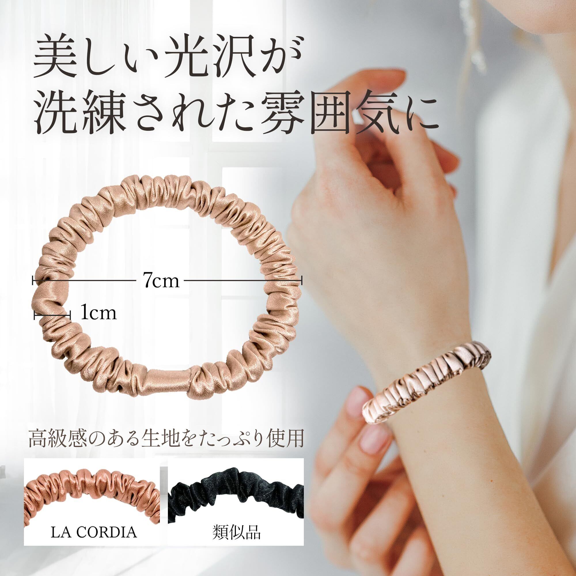 ①髪を守り、美髪へ導く ②しっかりキープして落ちてこない ③するりと外れるから抜け毛・切れ毛を予防し絡まらない ④跡がつきにくい ⑤ヘアメイクアーティスト監修カラー ⑥手首に付けてもおしゃれ ⑦日本国内で一つ一つ丁寧に検品・梱包