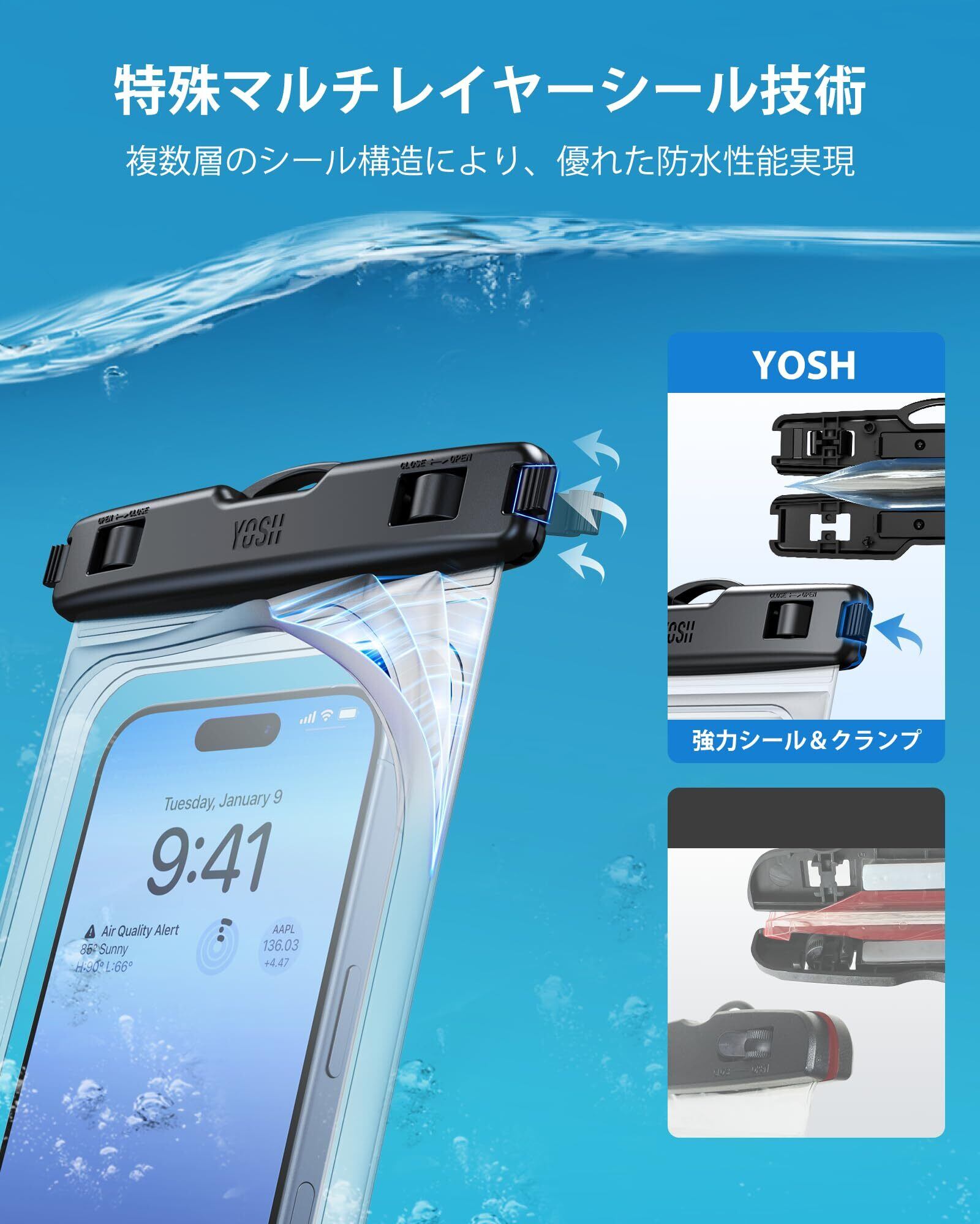 IPX8防水:YOSHスマホ防水ケースは、多層シール構造と最新の熱圧積層技術を組み合わせ、縁の堅牢さと完璧な防水性能を実現しました。IPX8認定を取得し、水深約30mで30分間の防水が可能です。ご注意:スマホケースを外してご使用ください。
