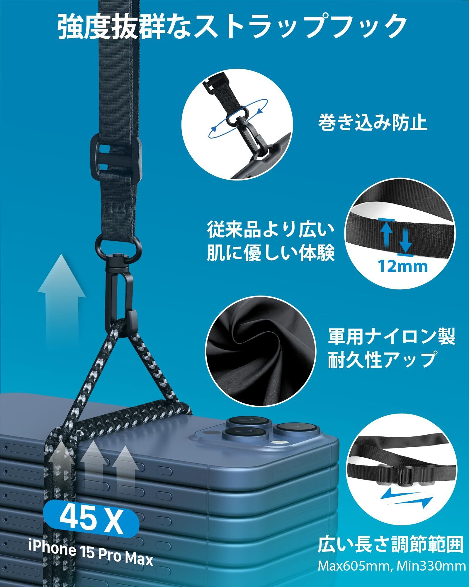 頑丈で実用的な改良版ストラップ:幅12mmのストラップは、広めで快適な着用体験を提供し、長時間使用しても窮屈に感じません。長さは330mmから605mmまで調節可能で、さまざまな体型やニーズに対応します。軍用ナイロン素材を使用し、耐久性と防水性があり、汗をかいても安全です。回転可能なフックヘッドがストラップの絡まりを防ぎ、使用時の便利さと整頓性を向上させます。