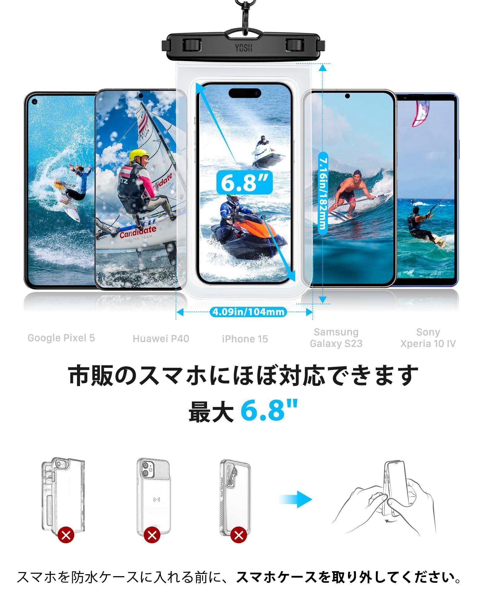対応機種:YOSHスマホ防水ケースの収納サイズは182mm×104mmですので、お使い前にご確認ください。iPhone、AQUOS、ARROWS、Pixel、Xperia、Galaxyなど(スクリーンサイズ6.8インチ以下)のスマホに対応しています。高品質なPVC素材を使用し、防水ケースに入れたままでもスマホの操作がスムーズに行え、高い透明度でiPhoneの顔認証にも対応しています。
