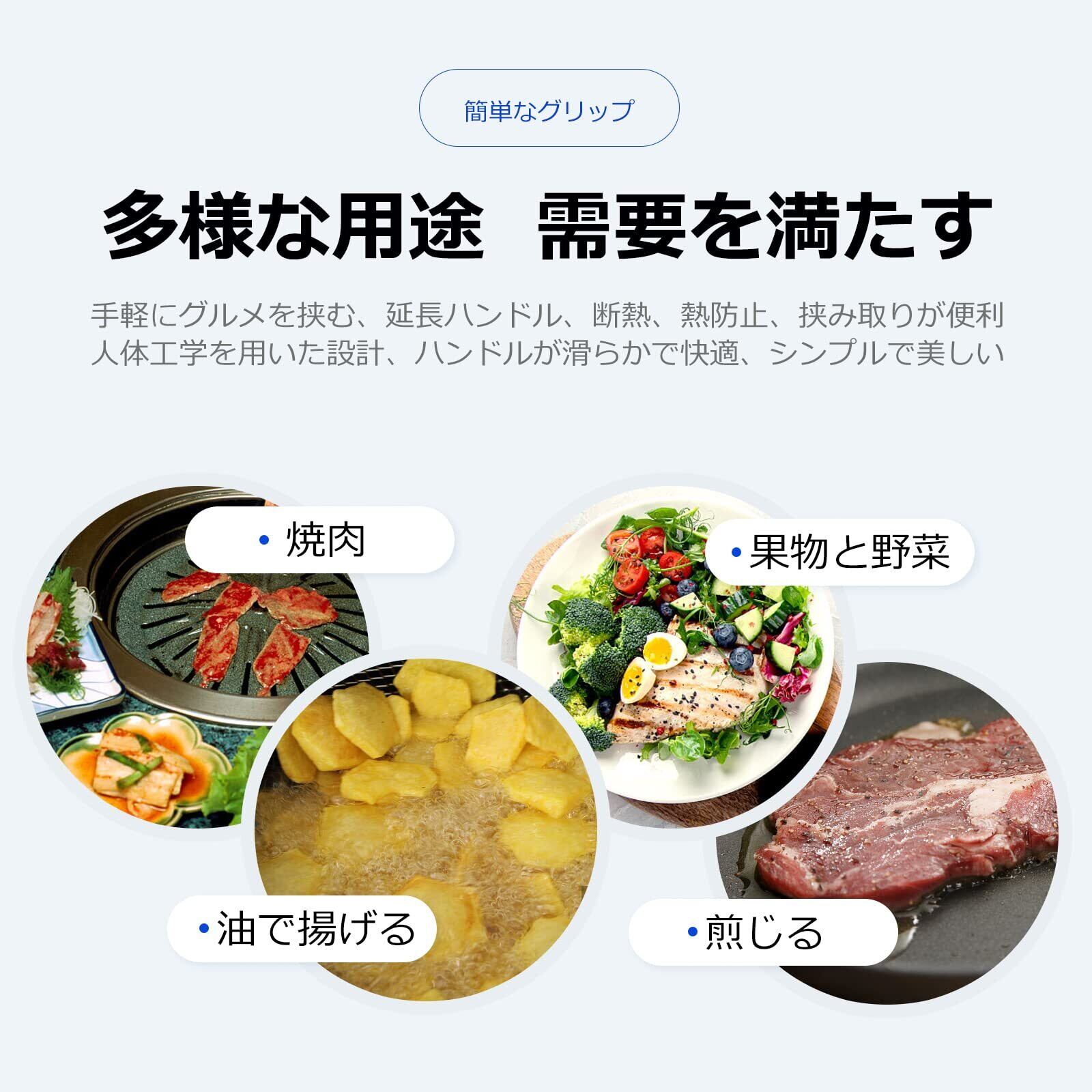 【幅広い用途トング】●キッチン用トング:食洗機対応で日々の調理に。●アウトドアトング:軽量設計でトング キャンプに最適。●業務用焼肉トング:焼肉店/ビュッフェの頻繁な使用に耐える耐久性。●調理用トング:鍋料理やサラダ盛り付けまで多用途トングです。※韓国 焼肉トングとしても、和食レストランの揚げ物トングとしても幅広くご活用いただけます。