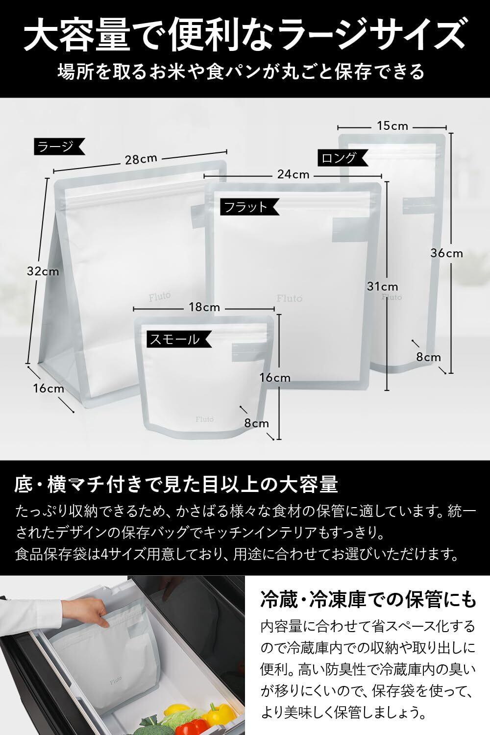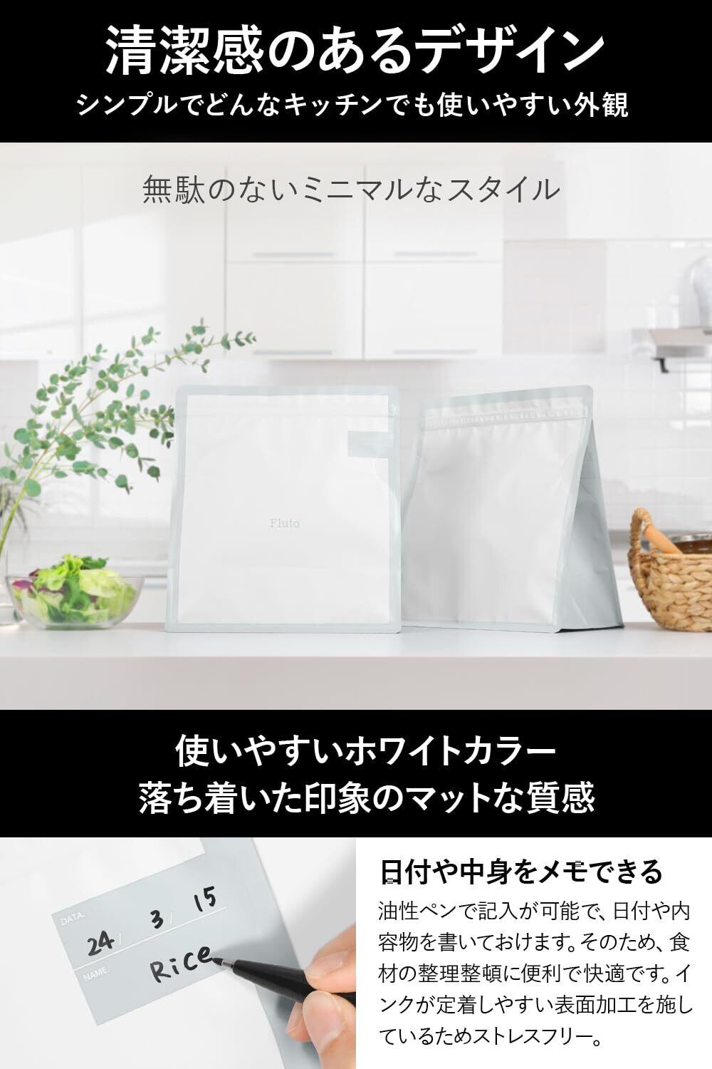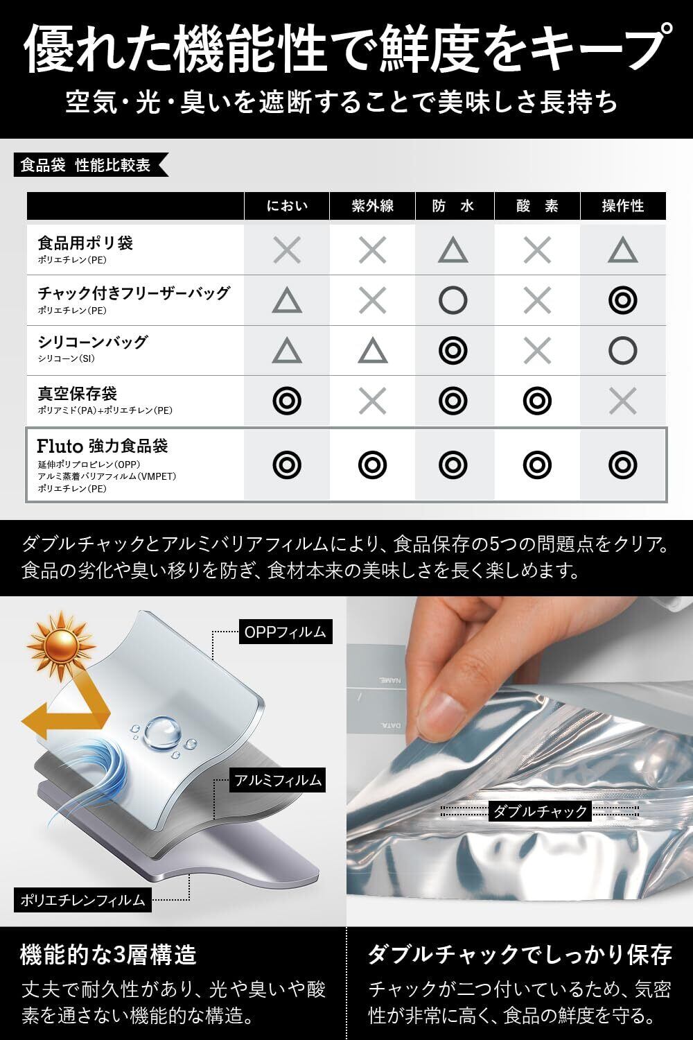 Flutoの食品保存袋はアルミバリアフィルムを挟んだ三層構造のアルミ袋で、空気・光・臭い・湿気を遮断し食品の鮮度とおいしさを長持ちさせ、お米や食パンの保存にピッタリ。フリーザーバッグ、ストックバッグとして多用途にご利用いただけます。
