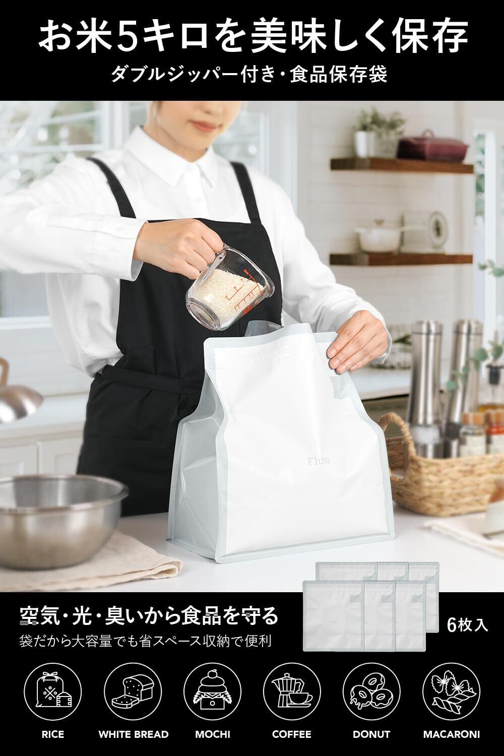 Fluto 食品保存袋 ダブルジッパー付き (お米 5kg 食パン 2斤用) 米袋 米びつ パン袋 食パン袋 白 ラージ 6枚