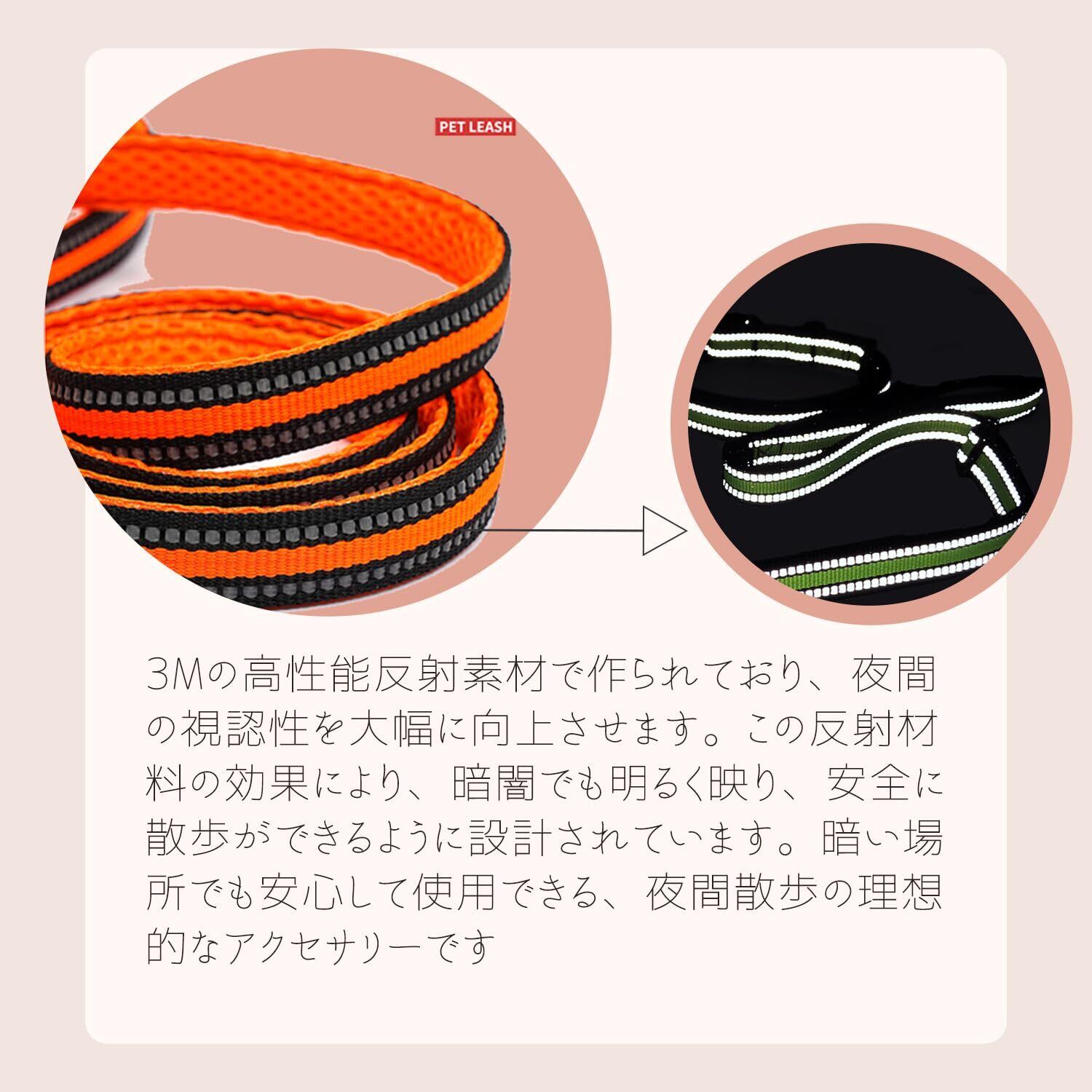 夜間の安全性: リードには3M反射ステッチが施されており、暗い夜道でも安全に散歩できるよう設計されています。この反射材料は光を反射し、夜間の視認性を高めます