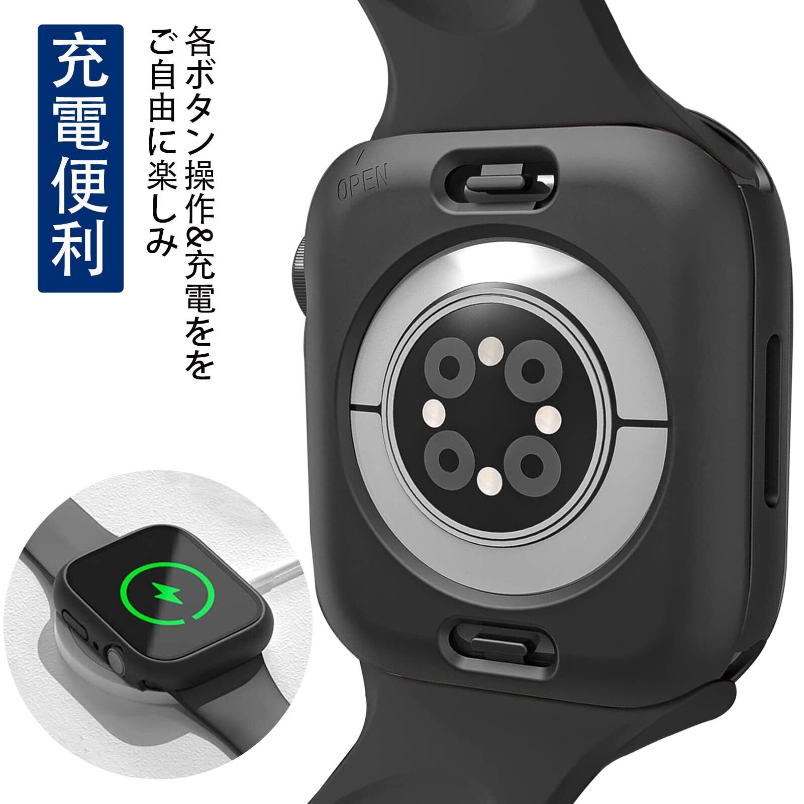 【究極の一体感】3 in 1一体型カバー(背面カバー+ガラスフイルム+側面カバー)。アップルウォッチを基に、精確に設計されておりぴったりとアップルウォッチと密着しボタンまで守り、抜群の一体感です。そして、バンド部分との干渉もなく、保護ケースを装着したまま充電出来とても便利です。