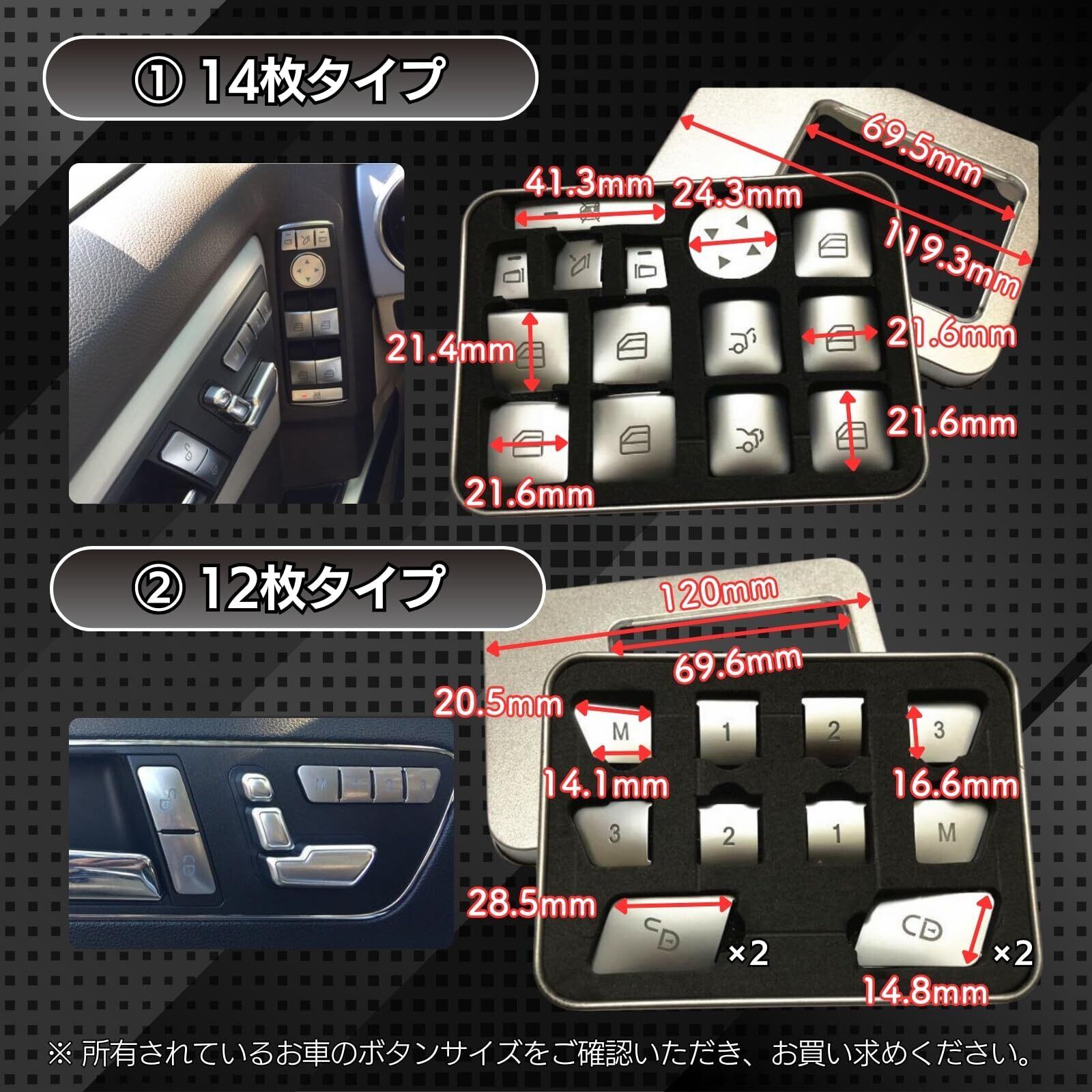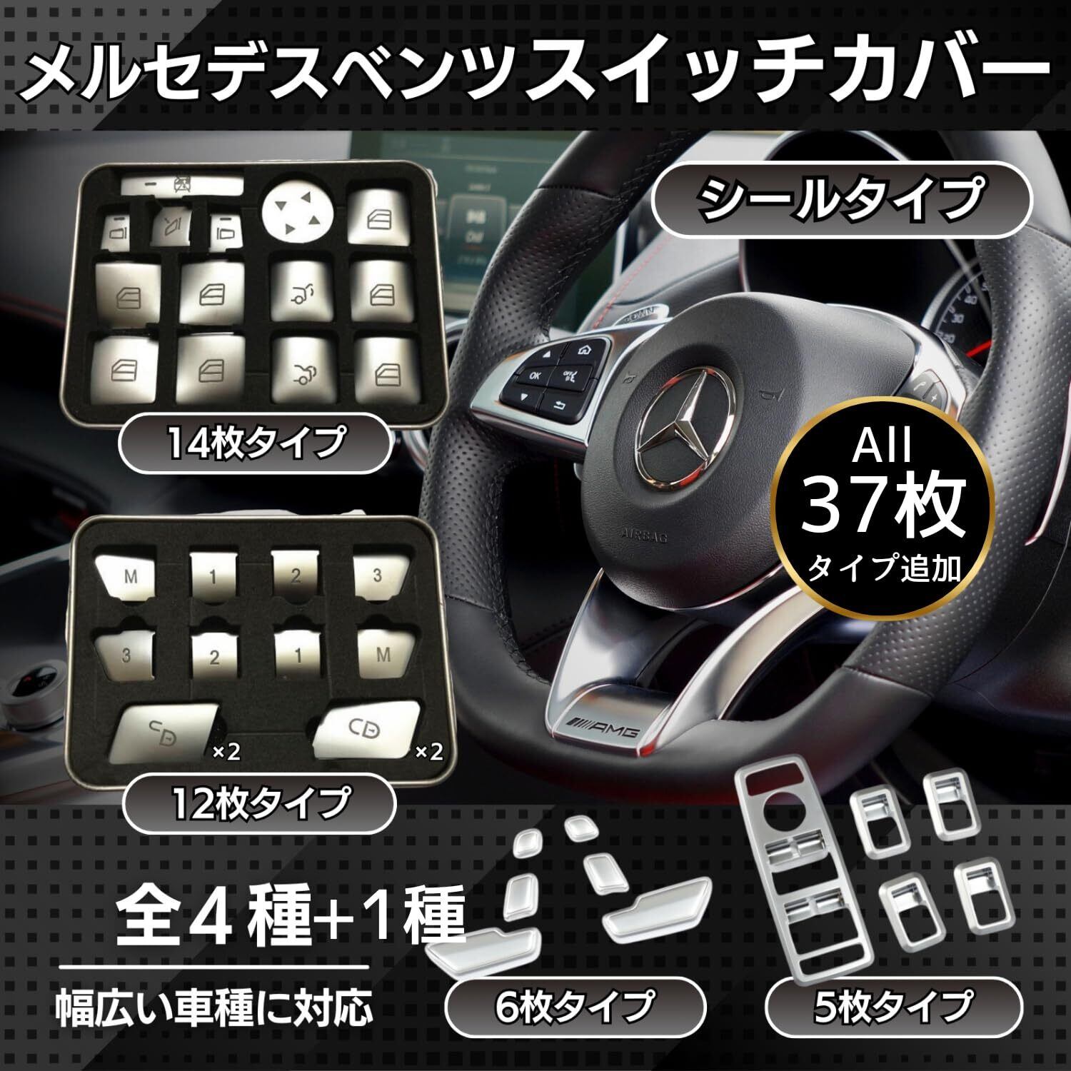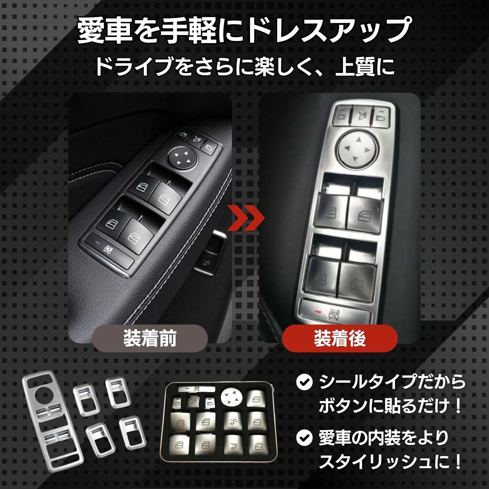 ベンツ用のシートスイッチやドアハンドルカバーになります。 既存のスイッチに取り付けるだけで簡単にドレスアップする事が出来ます。 取り付けが簡単なのも魅力の一つです。取り扱いは不要で、対象領域をマスキングまたはテープで貼り付けるだけで設置できます。