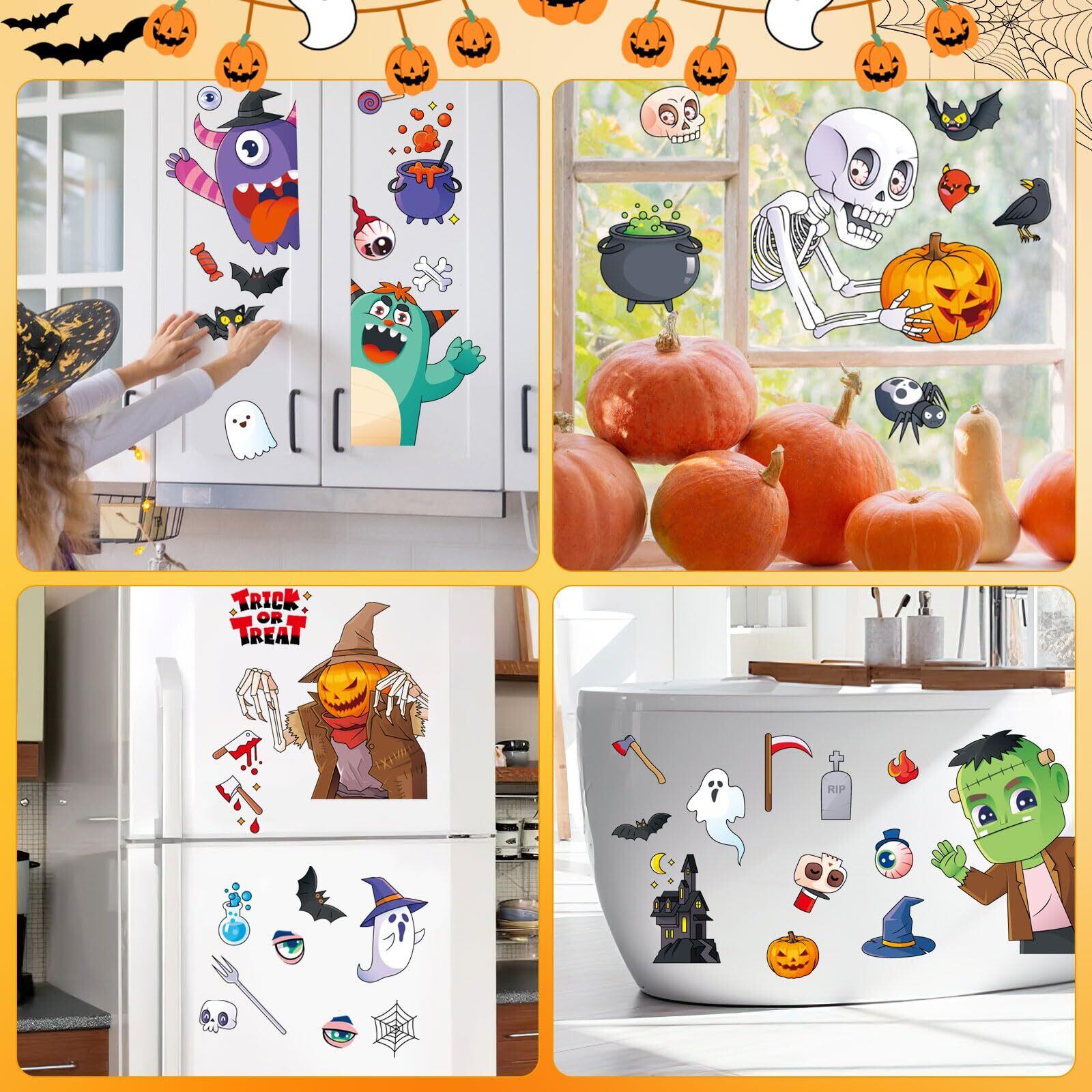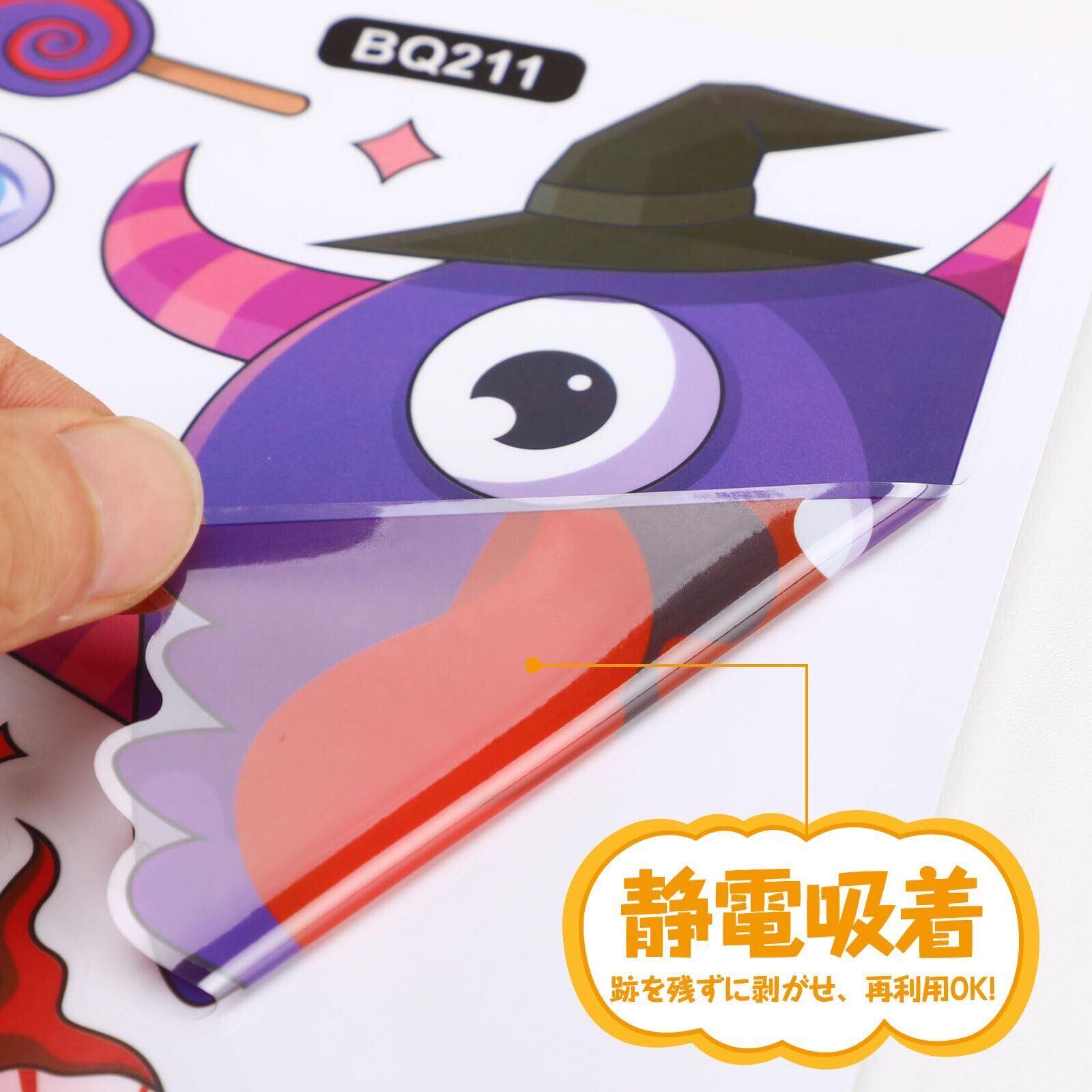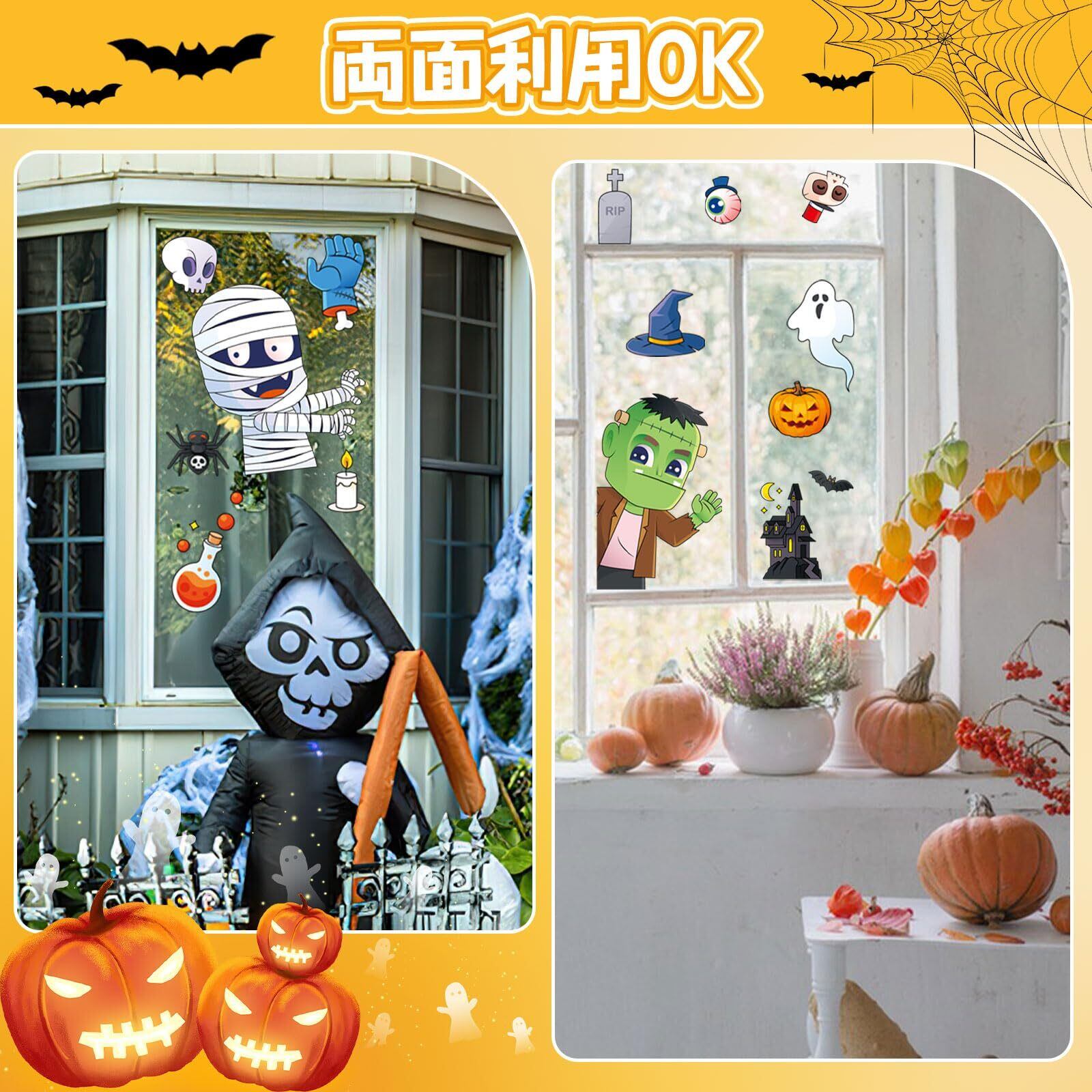 【適用場合】ハロウィン 静電ステッカーは窓、金属製のドア、鏡、冷蔵庫、タイルなどの滑らかな表面に適用します。自宅のインテリアだけでなく、自動車のウィンドウステッカー、店舗ディスプレイのハロウィーン 装飾、ハロウィンイベントのデコレーションなど、色々なシーンで活用できます。