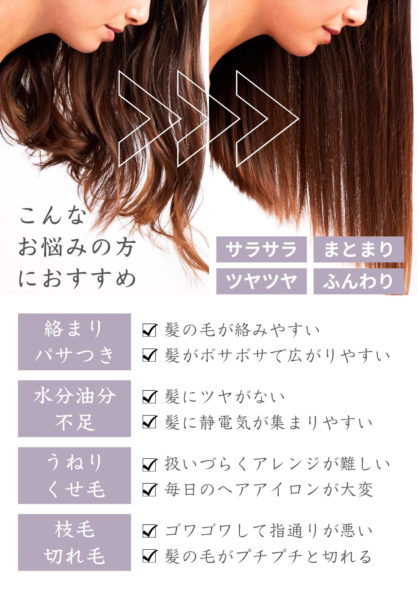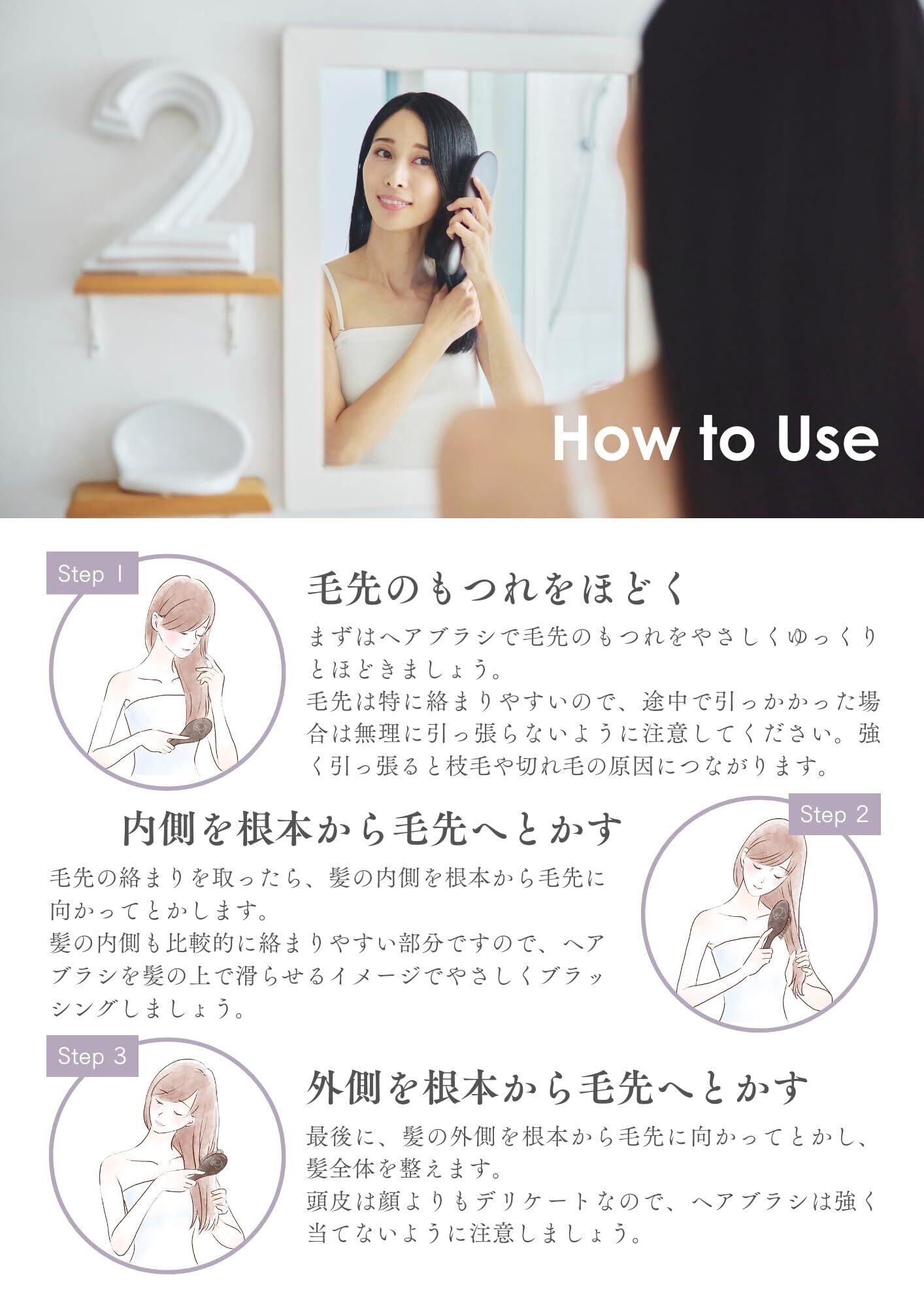 【輝くツヤ感UP】質感・光沢感向上、静電気防止。使い続けるほどに猪毛がお客さまの髪質になじみ、髪の質感を向上させ、より光沢感のある美しい髪に仕上げる。上質な天然豚毛ヘアブラシは適度な水分と油分を含んでおり、髪にうるおいを与え、キューティクルの大敵である静電気も防止してくれる