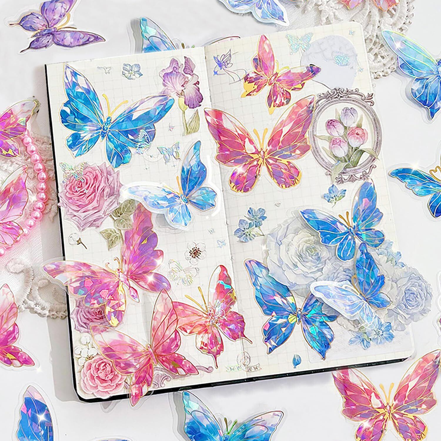 【コラージュ 素材】ステッカー4パック (1パックに10柄、各柄2枚ずつ入っています) 合計 80 枚の蝶のステッカー。ステッカーにはさまざまなサイズがあります、箔押しレーザ 、きらきら。