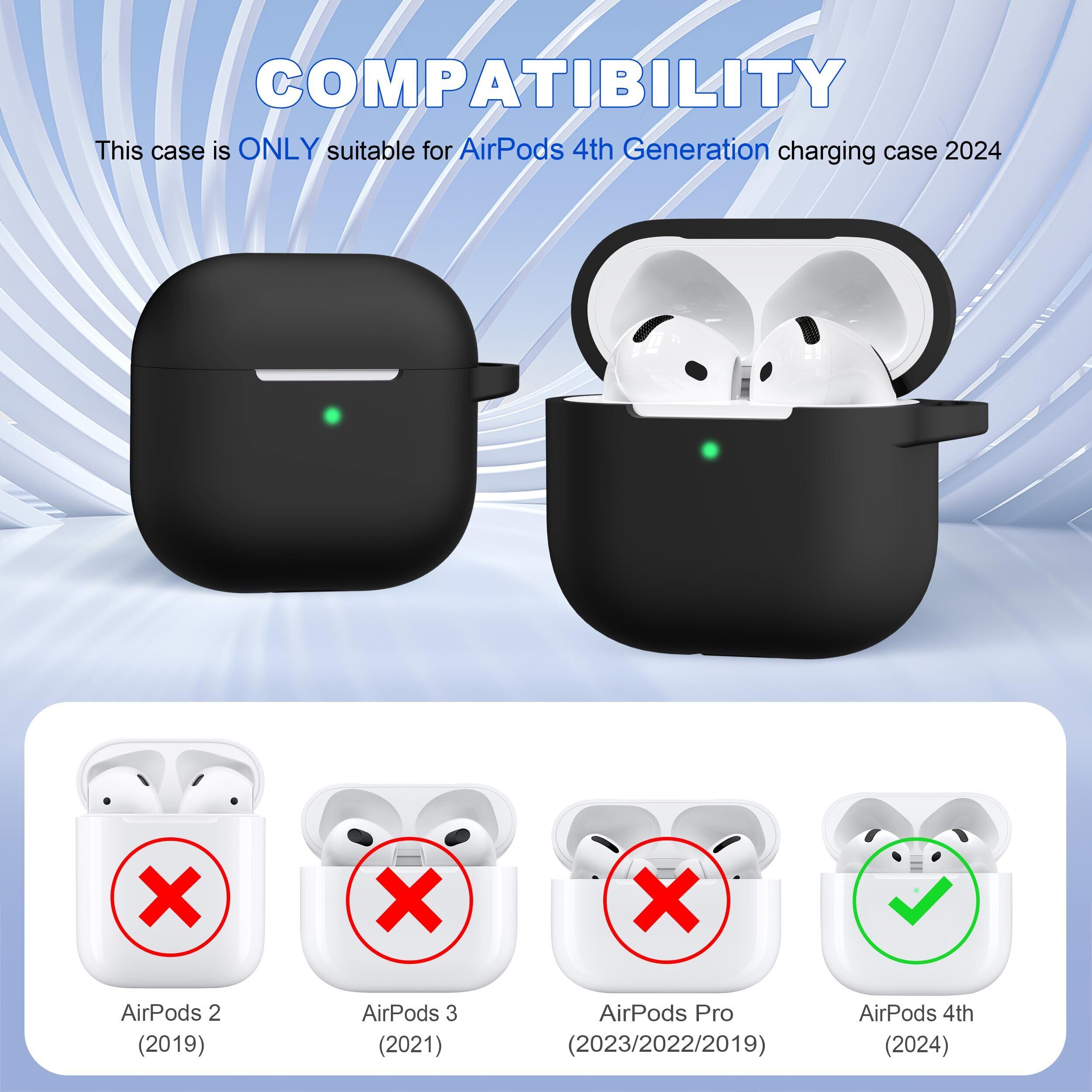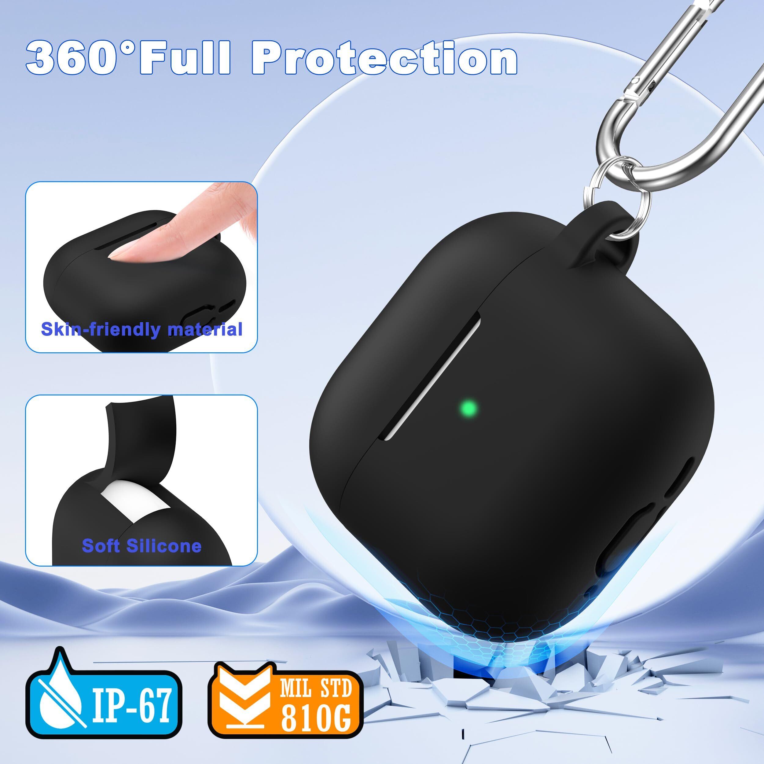 MHYALUDO AirPods 第 4 世代用ケースカバー、ミリタリーグレードのソフトシリコン製衝撃吸収 AirPods 用ケース、キーチェーンとクリーニングキット付き、ブラック