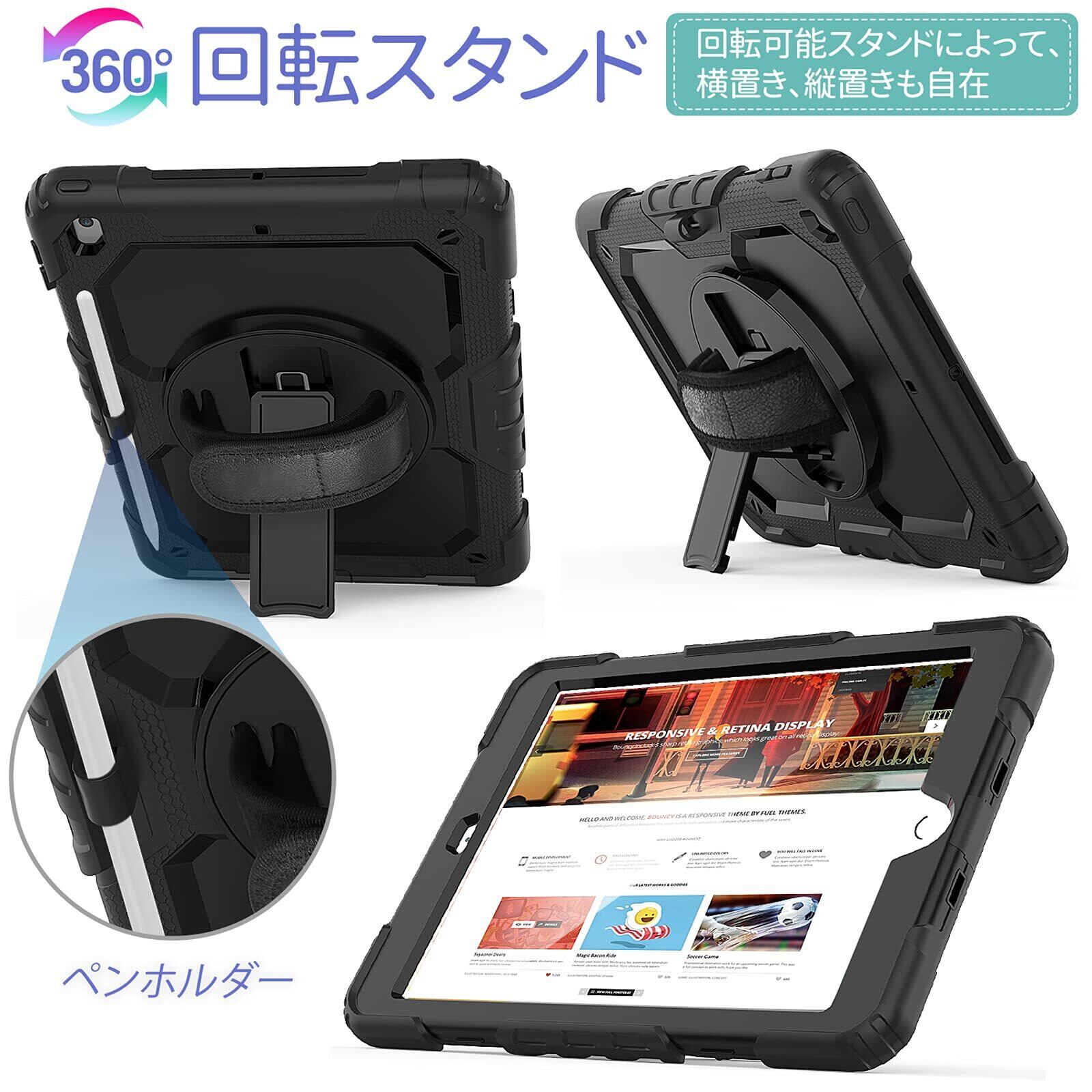 「ハンド&ショルダーストラップ」:バックカバーの回転盤には、手を差し込むとお手持ちのタブレットの重心をしっかり支えるハンドストラップが備わっています。また、最長49インチの調整可能なショルダーストラップが付属しており、仕事/ 学校/ 現場/ 工事/ 旅行など幅広い場合が非常に便利になります。