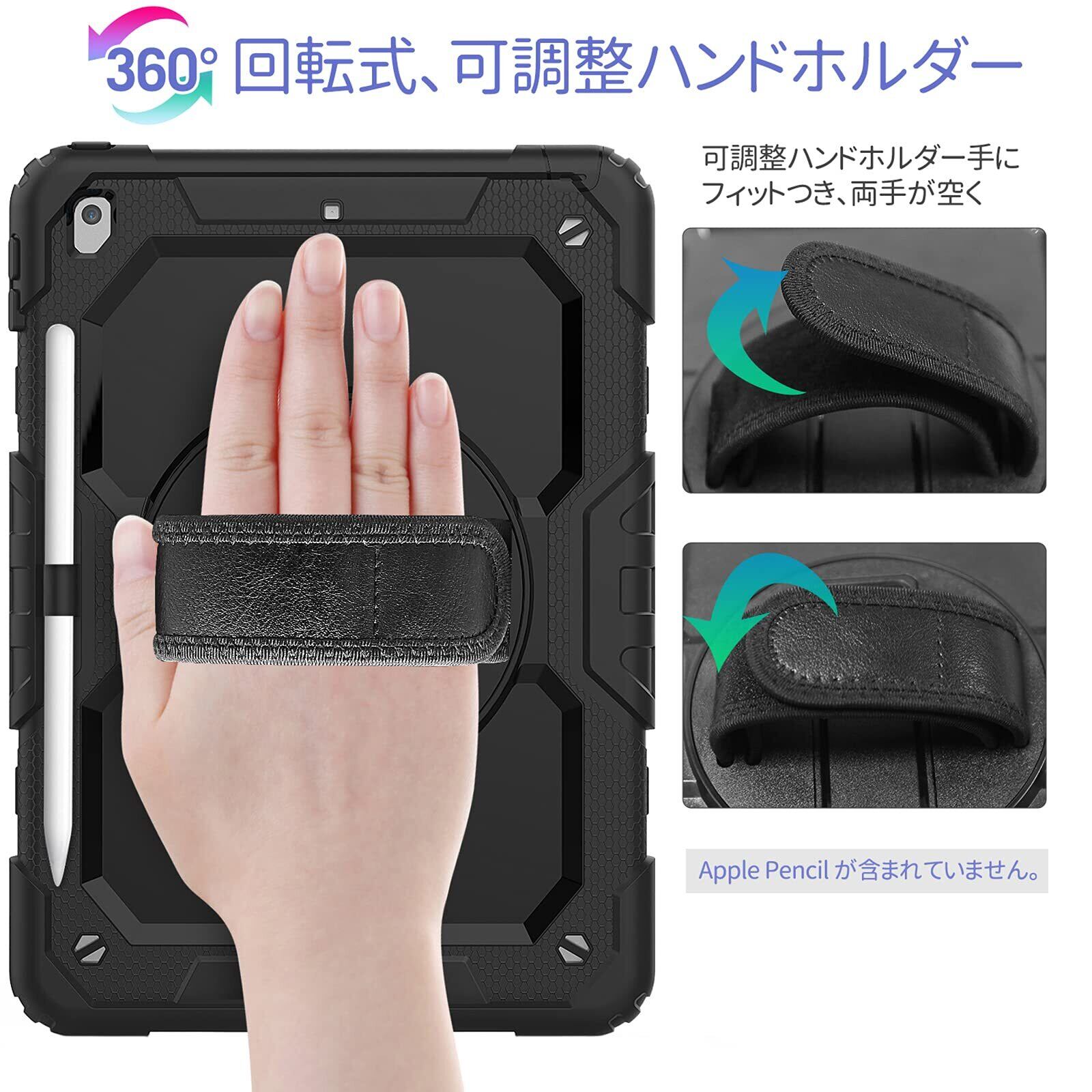 Timecity iPad 10.2 ケース 耐衝撃 iPad 第9世代/第8世代/第7世代 ケース 保護フィルム内蔵 360度回転スタンド ペン収納 肩紐 ハンドストラップ付き 頑丈 傷防止 肩掛け 多機能 iPad 10.2インチ 全面保護カバー 2021/2020/2019 (ブラック)(適格請求書発行可能)