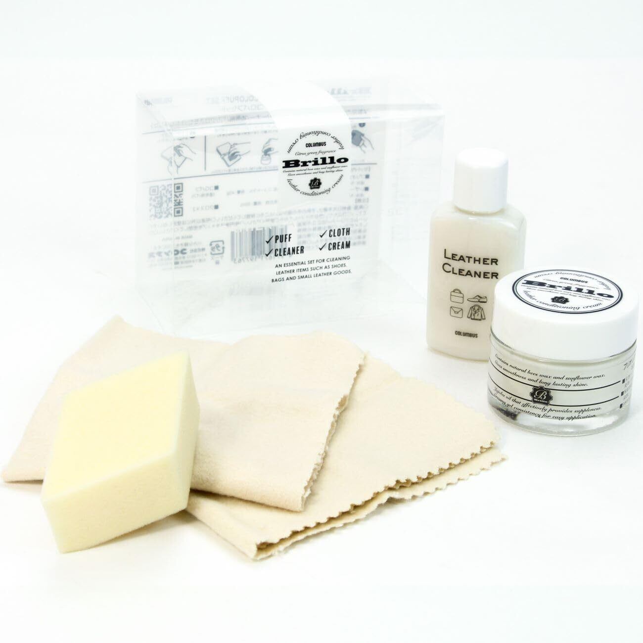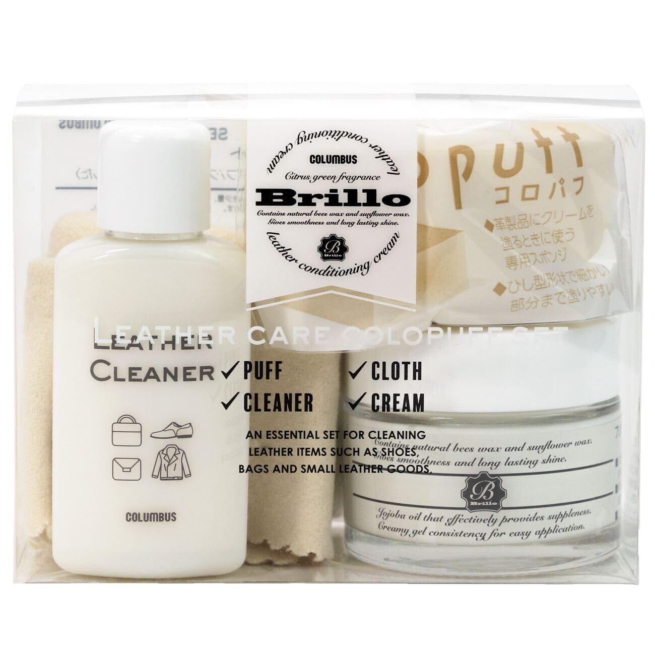 内容:ブリオレザーコンディショニングクリーム40g、レザークリーナー30ml、クリーム塗布用パフ、クロス2枚