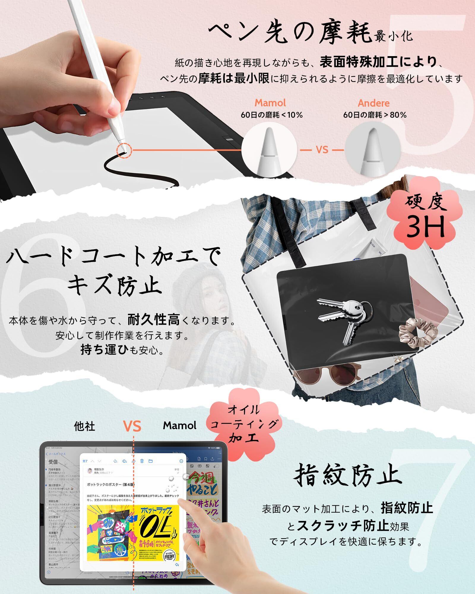 【上質紙に近い描き心地】最新素材を採用し、表面特殊加工により紙に鉛筆で描いた時の触感を実現します。表面特殊加工によりペン先の磨耗を50%低減させるため、従来品よりペン先が長持ちします。