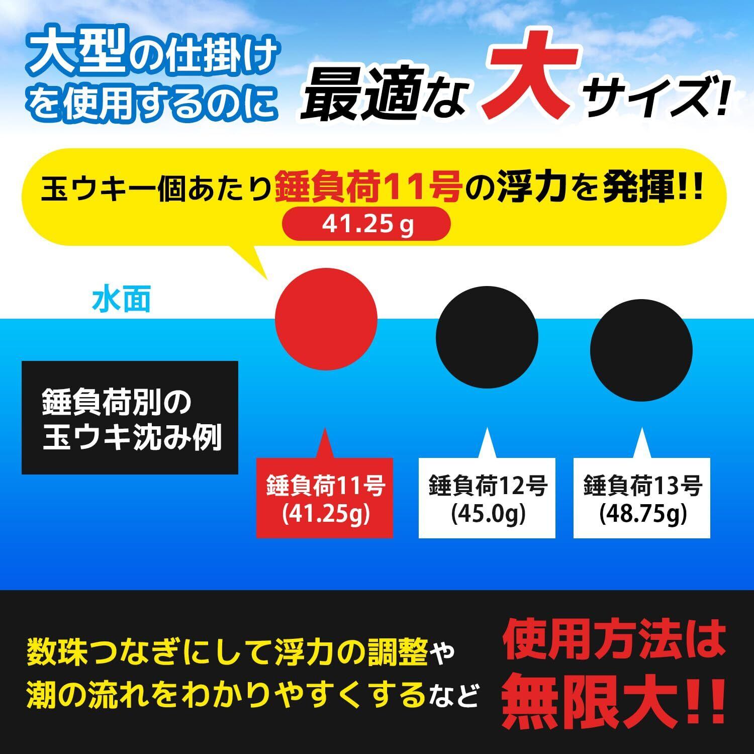 【錘負荷11号(41.25g)相当の浮力を発揮】玉ウキ1個で11号までの浮力を発揮します。複数個を数珠つなぎにすることで浮力+潮の流れを読むなど様々な使い方が可能。※12号の錘では水面より深く潜ってしまいます(検証済み)