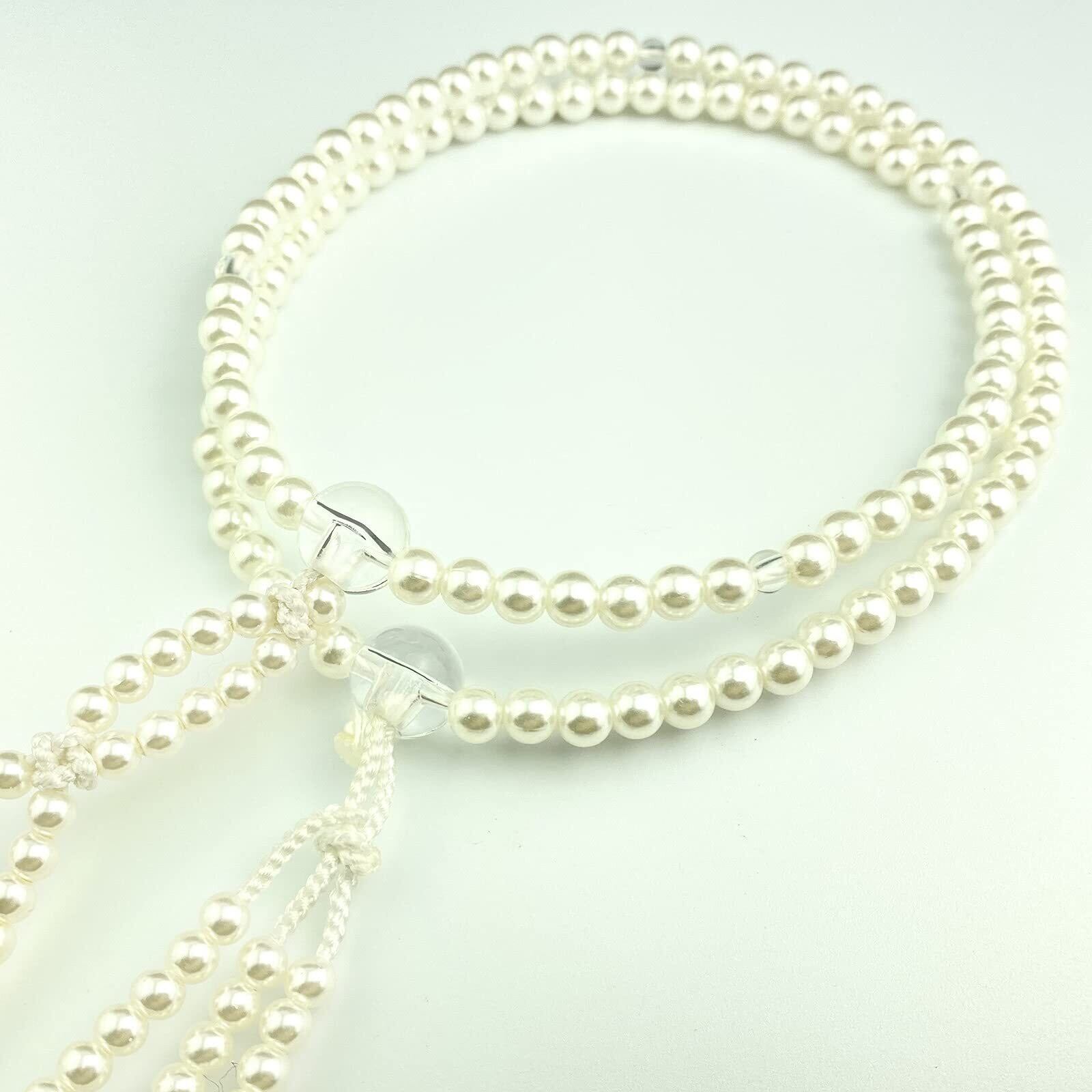 国際創価学会(SGI)用専門数珠です、 男女通用のMサイズ。 ABS樹脂に特別なパール色塗装をほどこし、とても美しいパールの輝きを実現しました。親玉と四天には透明なアクリル製玉が入って、オシャレです。