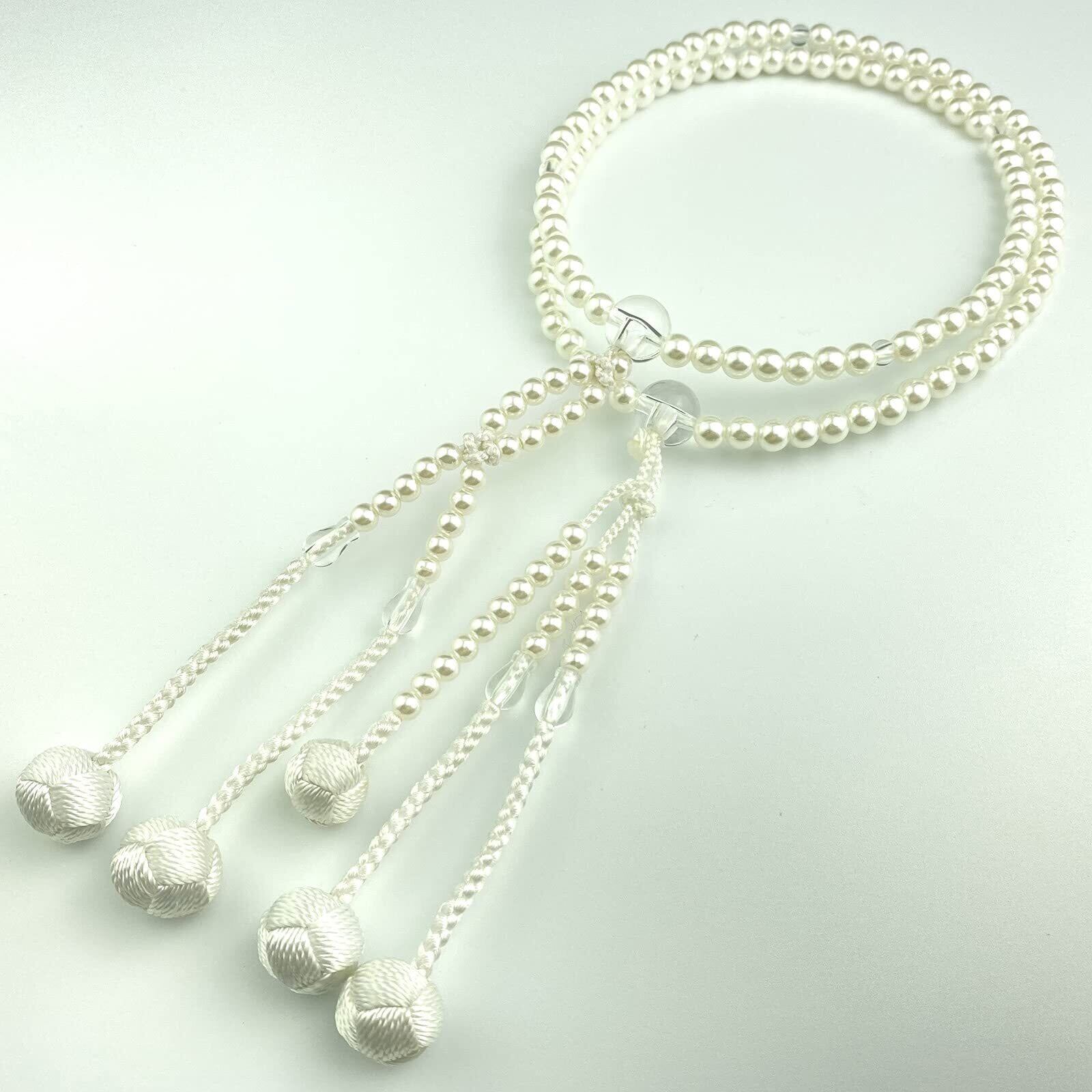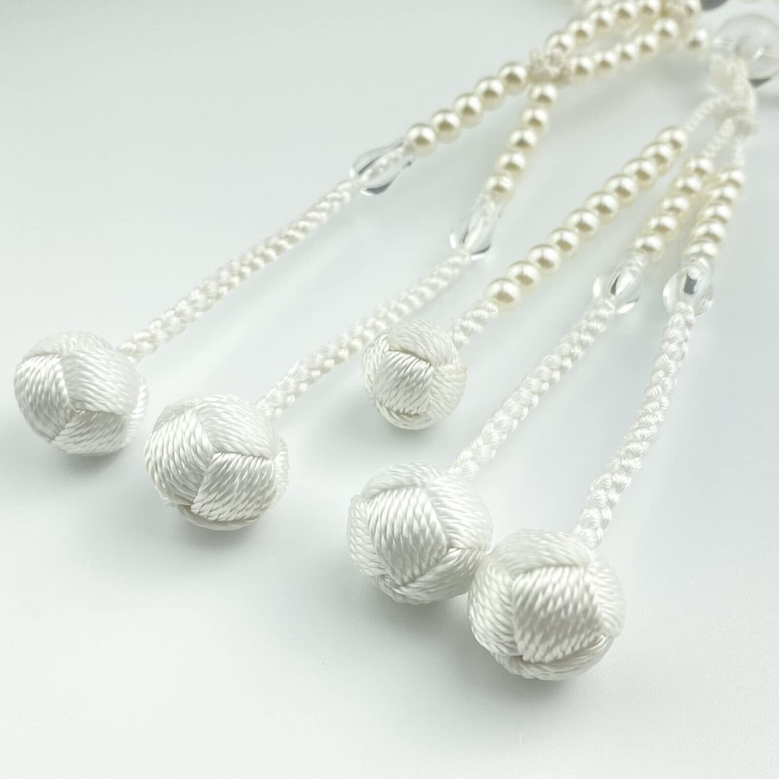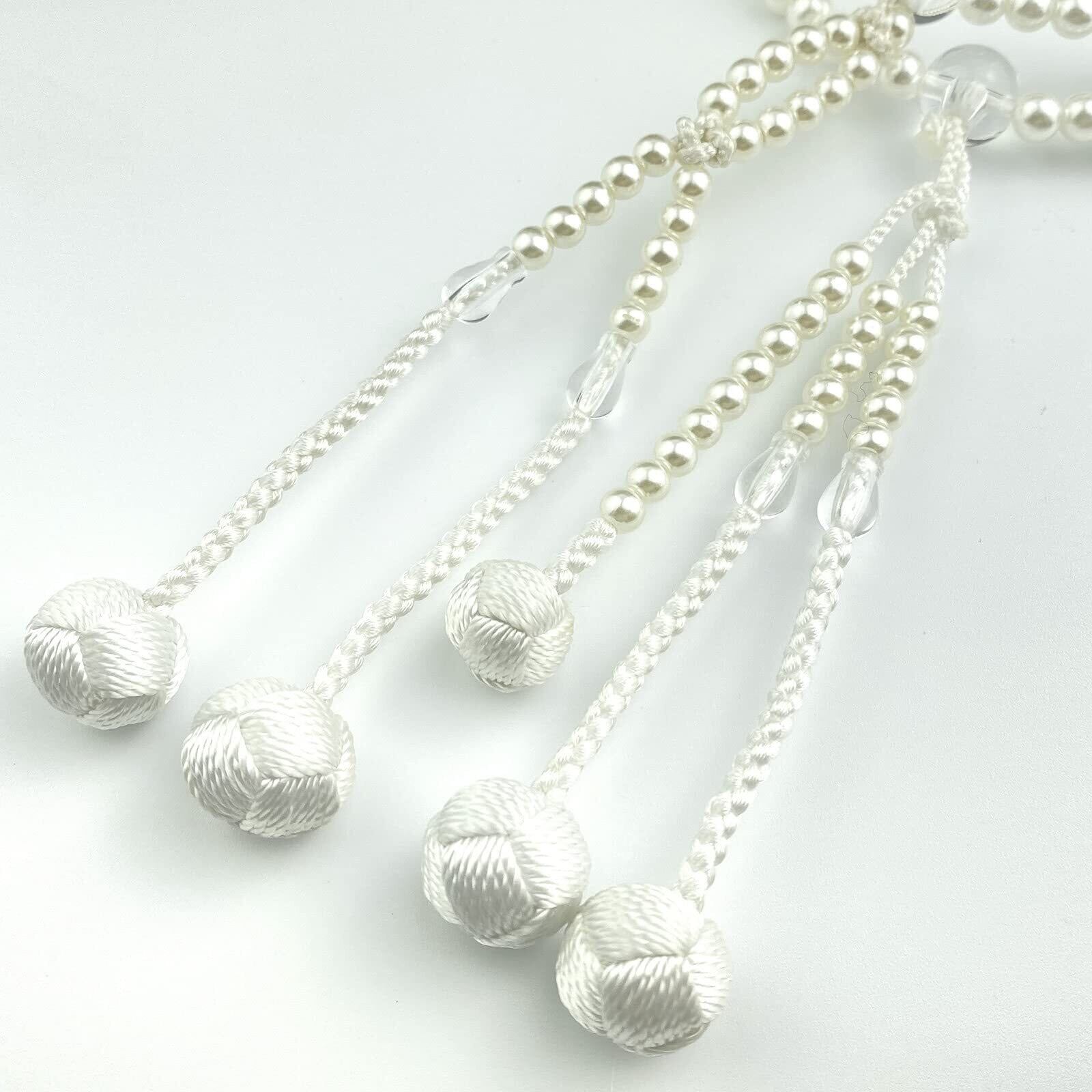 商品明細 主玉:6ミリパール( ABS樹脂製) 四天玉:4ミリ新水晶(アクリル製) 親玉:12ミリ新水晶(アクリル製) 房の色:白色手毬房