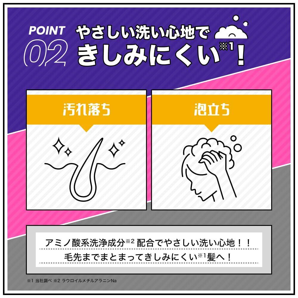 【やさしい洗い心地できしみにくい!】アミノ酸系洗浄成分配合でやさしい洗い心地!毛先までまとまってきしみにくい髪へ導きます。