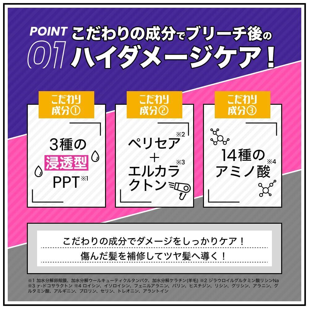 【こだわりの成分でブリーチ後のハイダメージをケア!】3種の浸透型PPTや、ペリセア・エルカラクトン、14種のアミノ酸などのこだわりの成分を配合し、傷んだ髪を補修してツヤ髪へ導きます。
