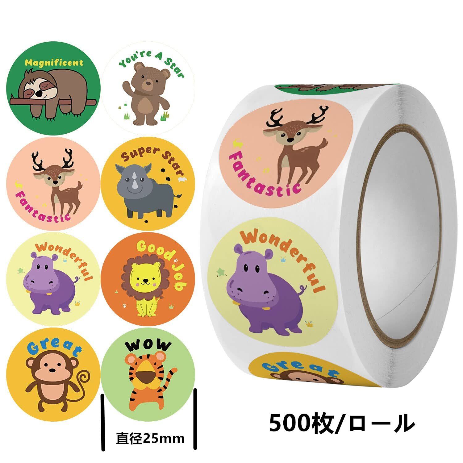 【ごほうびシール - 商品仕様】500枚/ロール 5ロール 合計2500枚 、直径25mm 、40柄