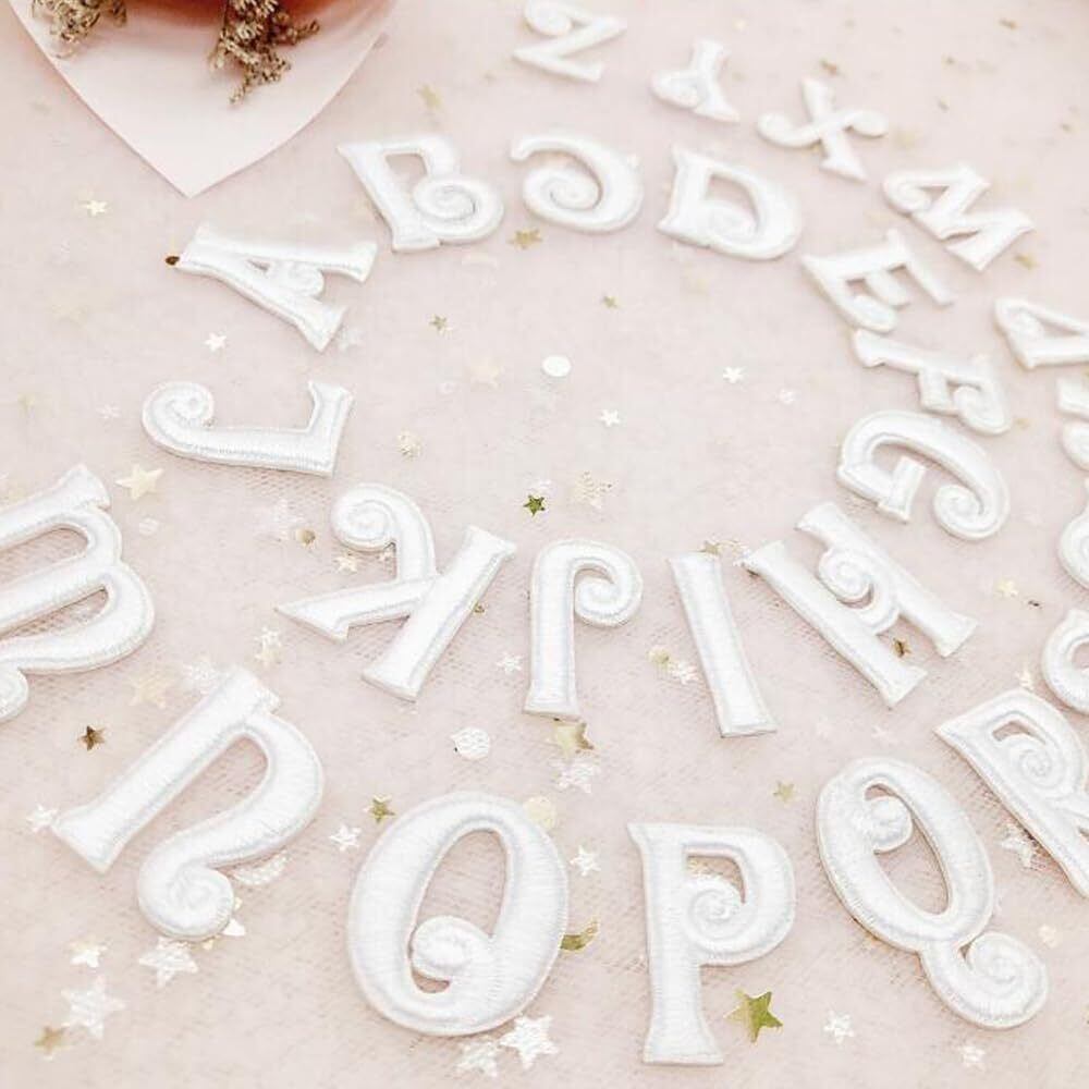 【パッケージ内容】アルファベットの 刺しゅうワッペン26枚セット。(針包み付き)。