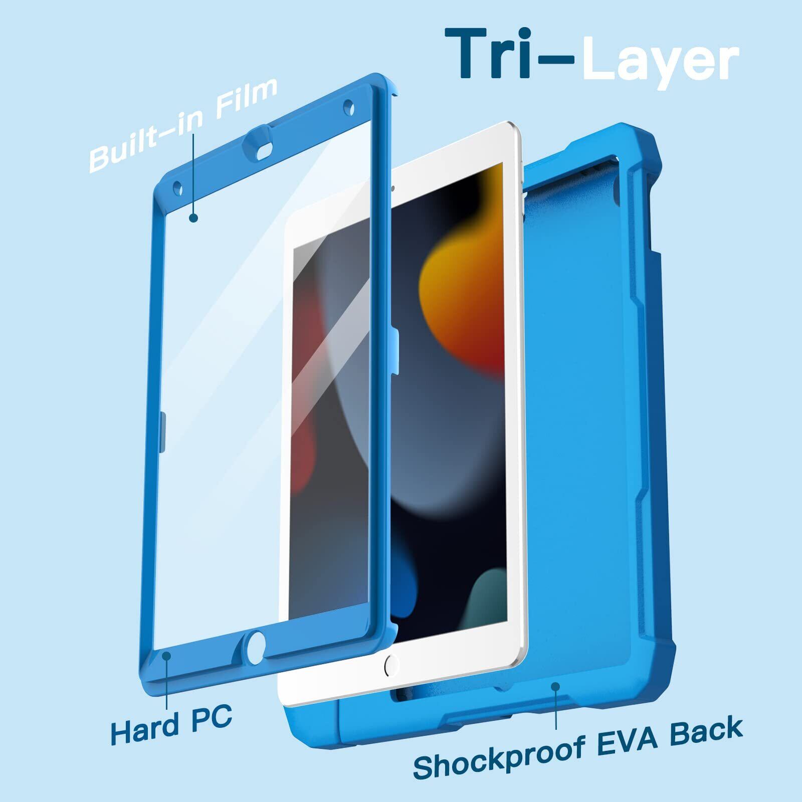 JEDirect 子供用 iPad 10.2インチ ケース (第9/8/7世代、2021/2020/2019) 液晶保護フィルム付き 耐衝撃 フルボディハンドルスタンド タブレット保護カバー (ブルー)