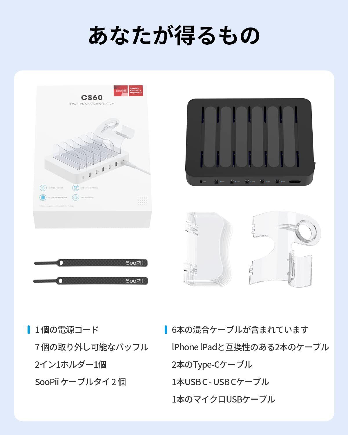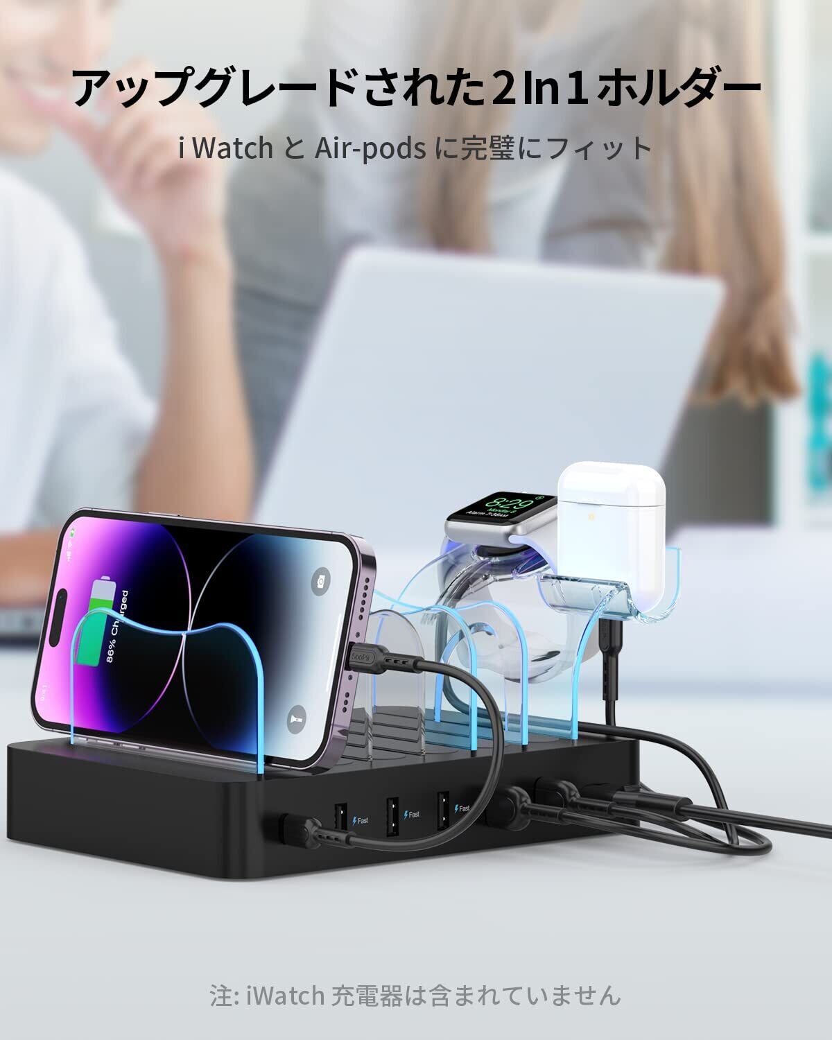 首佩 60W 6ポートUSB急速充電ステーション、PSE認証済 充電スタンド 6本の充電ケーブルが含まれ、 iPhone iPad iWatch iPodと互換性があり、I-Watch充電器ホルダー、電話、タブレット、その他の電子機器用