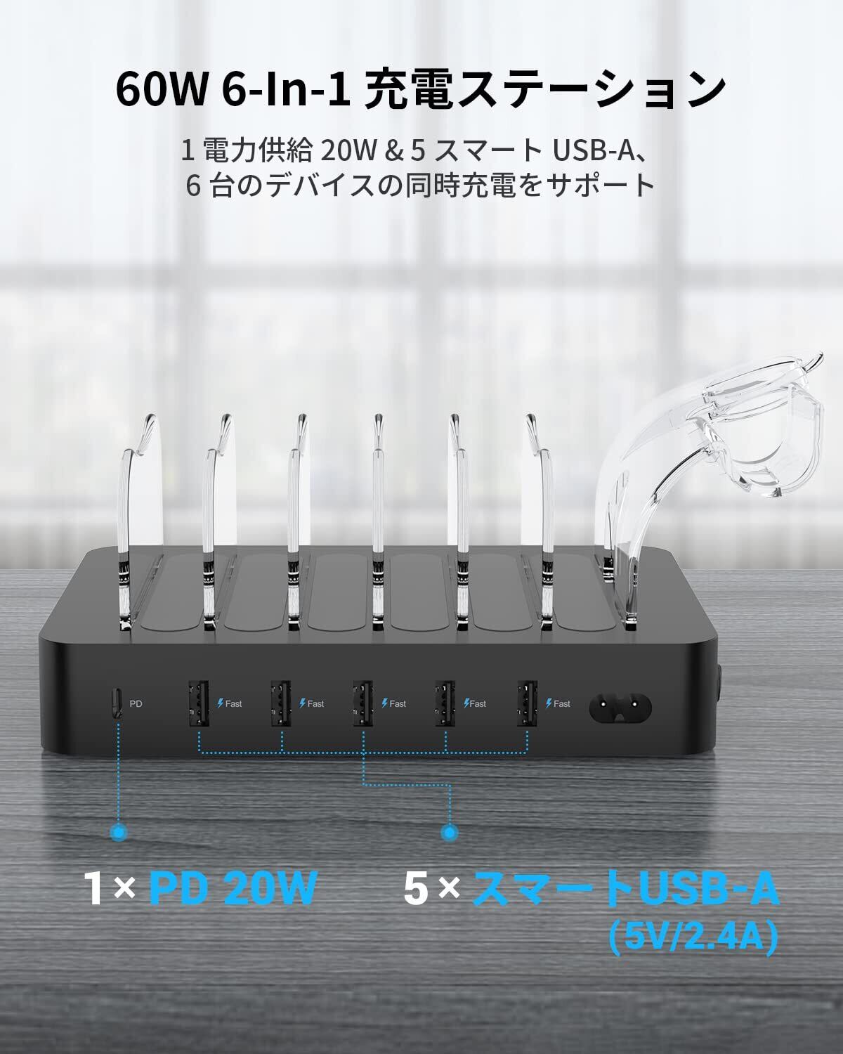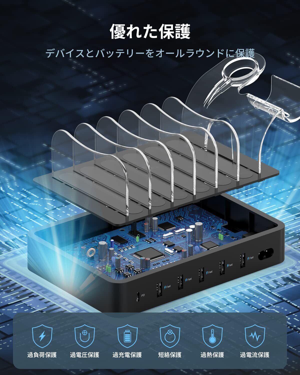 【特価商品】首佩 60W 6ポートUSB急速充電ステーション、PSE認証済 充電スタンド 6本の充電ケーブルが含まれ、 iPhone iPad iWatch iPodと互換性があり、I-Watch充電器ホルダー、電話、タブレット、その他の電子機器用 | gsmshop