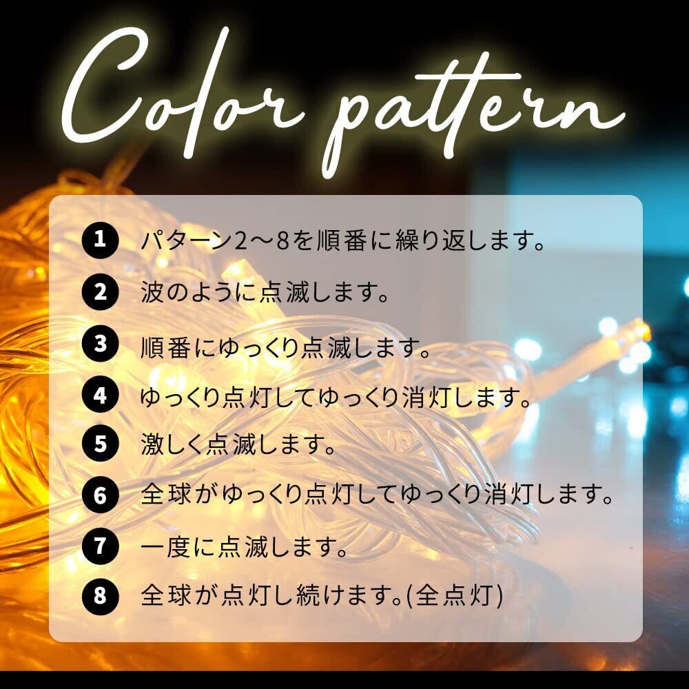 【華やかに空間を飾る…輝きのあるイルミネーション】 とても鮮やかで十分な輝きがあります。点滅パターンは8パターンあるので 間隔をあけてゆっくり光ったり、すべてのライトが賑やかに光ったり…、お好みのパターンで華やかな演出も可能!様々なケースで楽しめます。 (コントローラーで点灯パターン切り替え可能です。)
