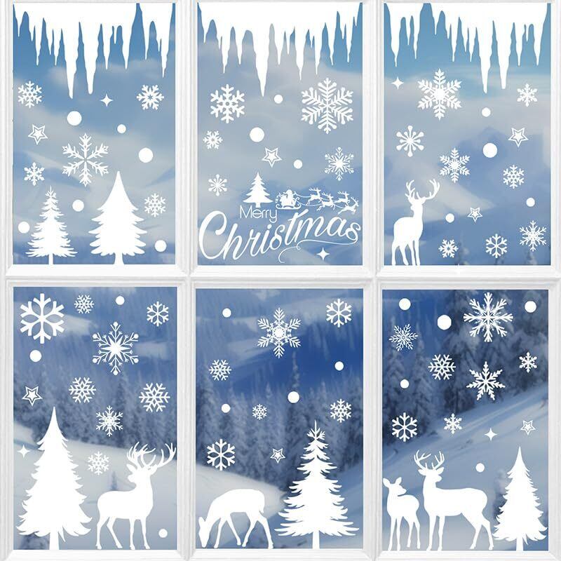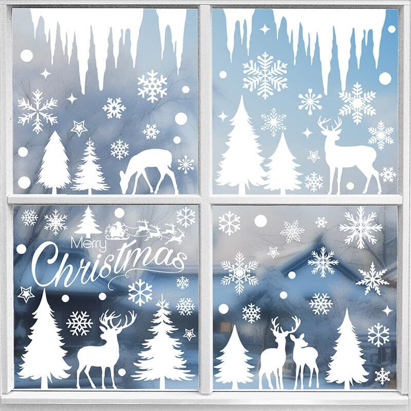 【大容量214点入り】雪の結晶・トナカイなど北欧のデザインたっぷり入ってる静電気ステッカー、このセットだけで窓を可愛くなります!白一色なのでカンタンに店舗やお部屋が一気にホワイトクリスマスに変身