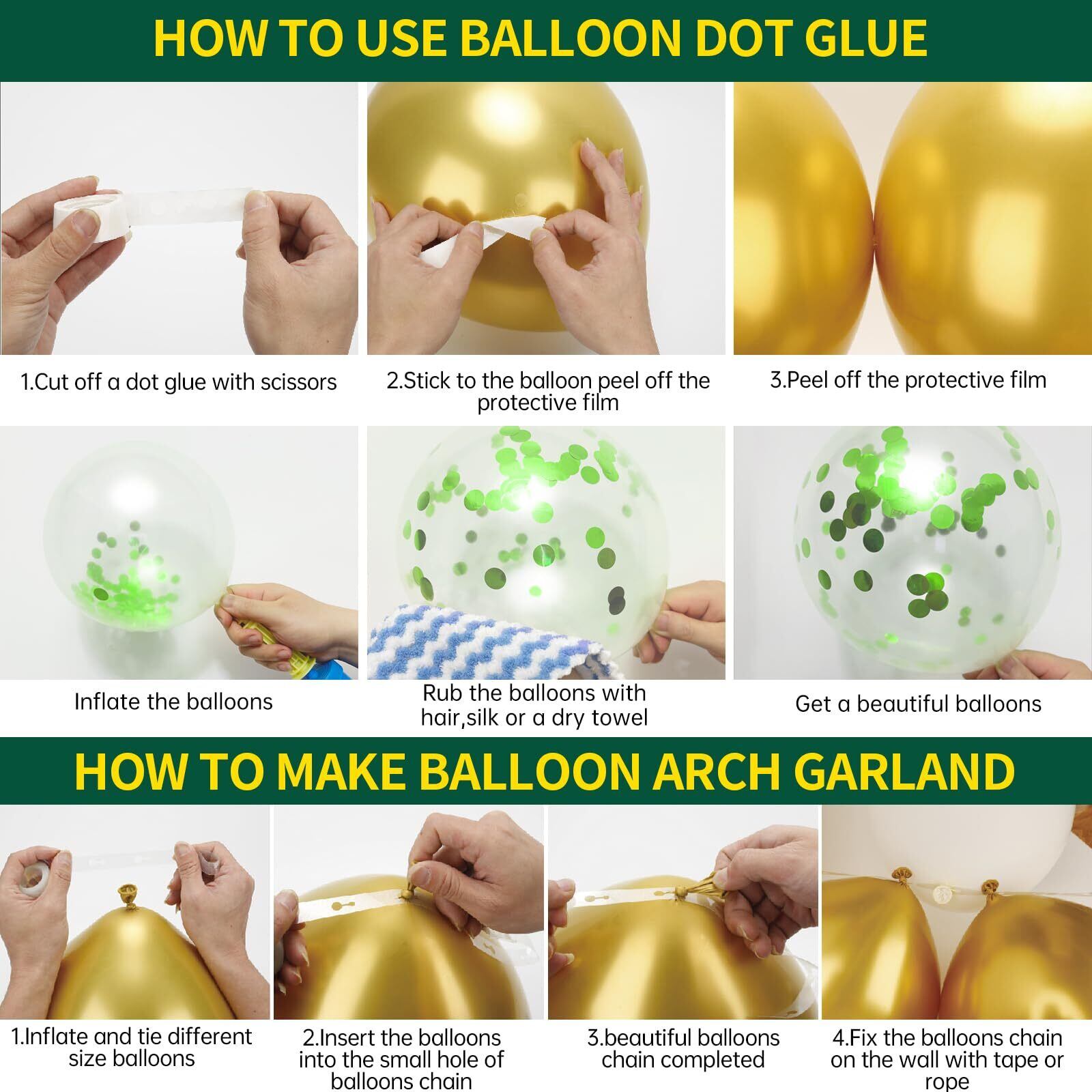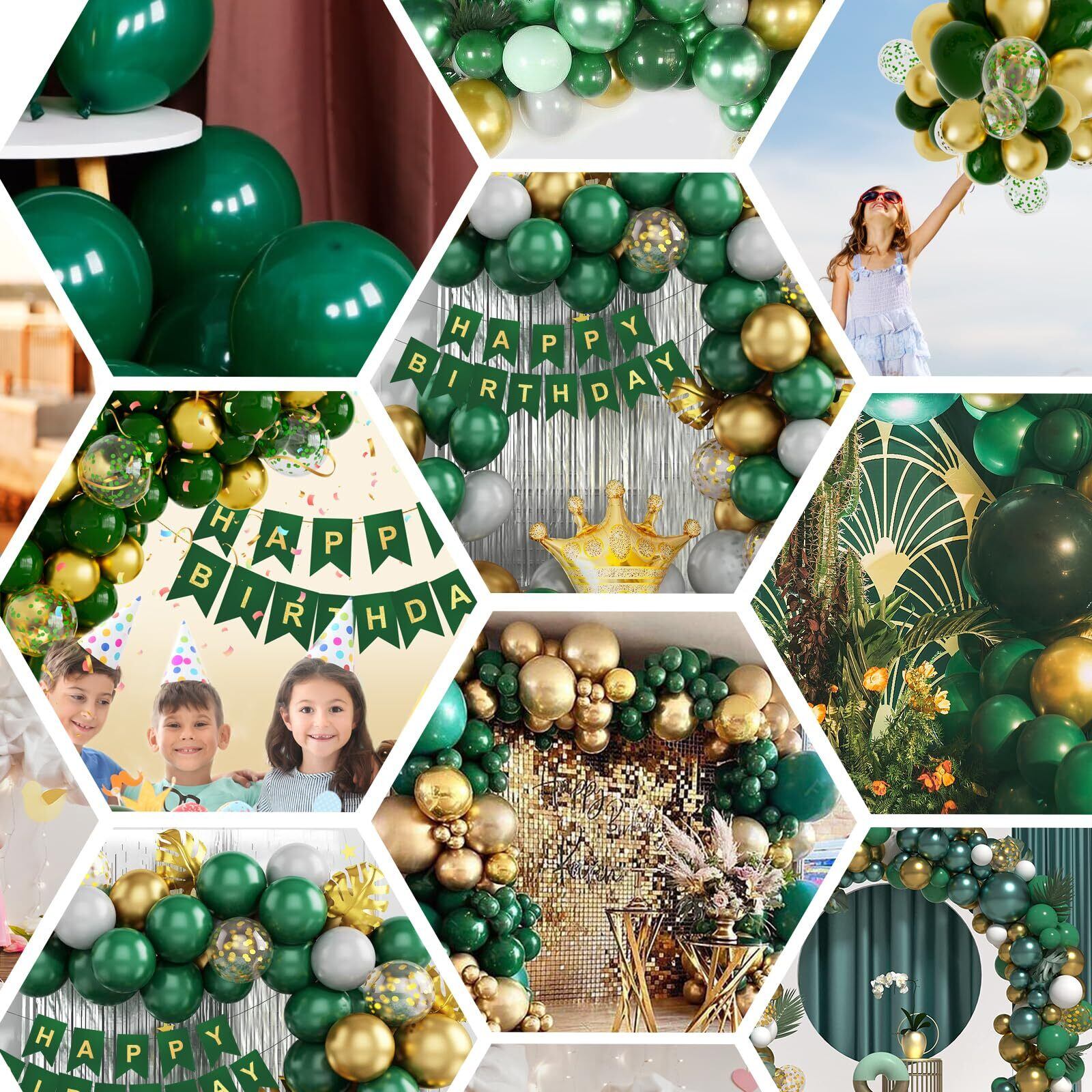 パッケージが含まれています:100個風船(緑、金、緑の紙吹雪)、1pcs事前にひもで縛られた大きな幸せな誕生日のバナー、1 *ドットのり、1 *バルーンストリップ、2 *リボンを含む。