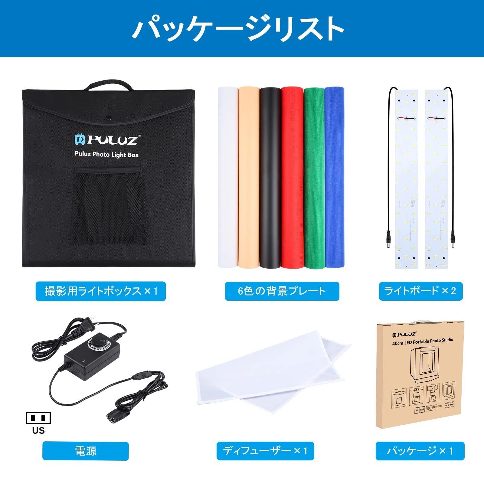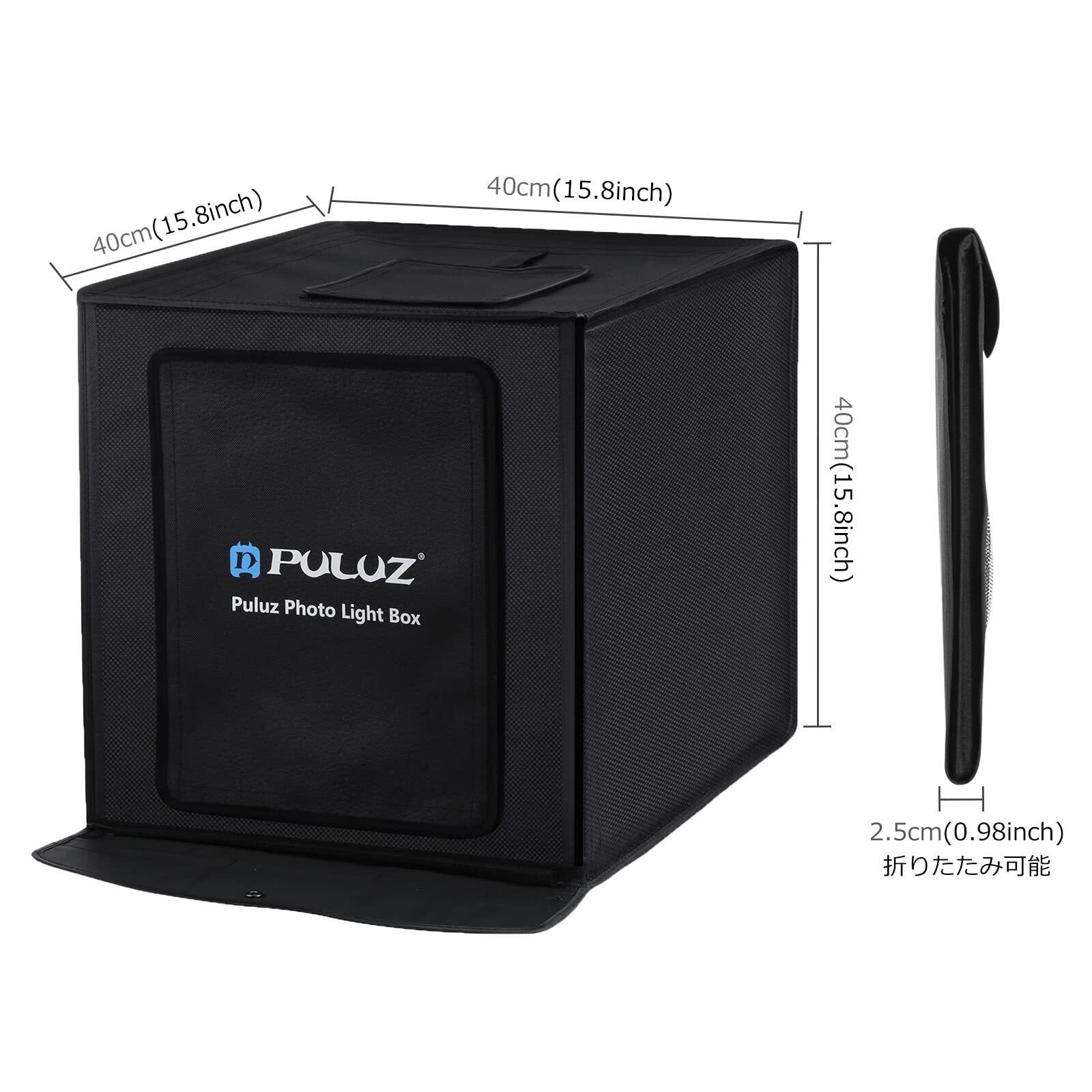 【在庫セール】【40cm】PULUZ 撮影ボックス 40*40*40cm撮影キット 調光可能 簡易スタジオ 背景6枚 2400LM 64PCS 5500K超高輝度LEDライト2本付き ディフューザー1枚 物撮り用ボックス 撮影ブース40cm 簡易撮影スタジオ 組立簡単 俯瞰撮影 ポータブル折り畳み式照明ボックス (撮影ボックス40cm) | gsmshop