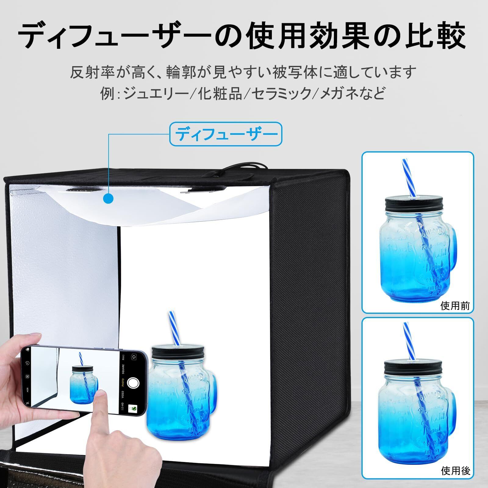 【ディフューザー付き】この0物撮り用ボックスには光を柔らかくし、柔らかく滑らかな照明効果を生み出すディフューザーも付属しています。 スタジオ内部のシルバー反射材との組み合わせで、影や光の反射を抑えた均一なライティングを実現します。このような照明環境では、被写体に光と影の柔らかな質感を与えることができます。