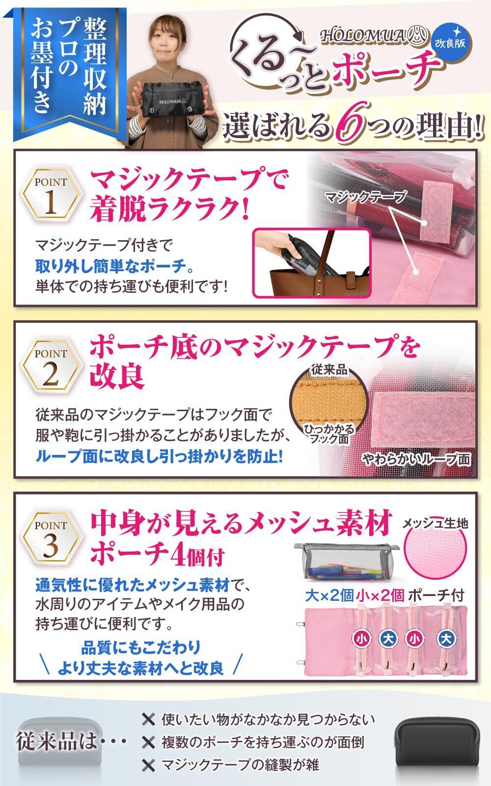 【整理収納のプロが監修】HOLOMUAの メイクポーチ は「大容量の荷物をコンパクトに持ち運べるように」という想いから生まれました。整理収納アドバイザー監修のもと、機能性や素材・形状を専門家と共に検討を重ねて日本の企業が製作を行いました。 化粧ポーチ を少しでも多くの方にお使い頂くため、リーズナブルにお届け致します。 【コンパクトサイズで大容量】4つのメッシポーチが1つにコンパクトにまとまる折りたたみ式 トラベルポーチ です。荷物が多いときも1つにまとめることでバラバラにならず、スッキリと収納できます。旅行や出張、アウトドア、レジャー、温泉、スポーツジム、ゴルフ場などのお出かけにも大変便利です! 【使いやすさと安心へのこだわり】①4つのポーチはマジックテープで取り外し可能で、1つにコンパクトに収納でき単品でも使用できます。②高品質メッシュ素材を使用することでポーチは通気性が良く、コスメからアメニティグッズまで蒸れずに収納できます。中身が見えるので探す手間もありません。③ストラップはポーチの中身に合わせて調節可能で4つのポーチをしっかり収納できます。④ホルムアルデヒド検査に合格済み。肌に触れる物なので素材の安全性にもこだわりました。 【他社との違いは徹底した検品体制】HOLOMUAの製品は日本国内で企画販売を行っております。お客様に満足してご利用いただきたいという気持ちから1品1品、丁寧に検品を行っております。中でも「生地の破れの有無」「汚れや傷の有無」「強い異臭の有無」「ファスナーの開閉」「縫い付けが甘いの有無」「ほつれ有無」「糸きり等の作業」については徹底した検品強化をしております。 【安心の120日間長期】「インターネットでの買い物は、実際に商品を手に取って触って選べないから不安…。」 そんなお客様にも安心してお選び頂けるよう、HOLOMUAでは独自の120日間長期対応を行っています。万が一、当社の メイクポーチ ( 化粧ポーチ )にご満足いただけない場合や商品に不具合があった場合はお気軽にご連絡ください。すぐに交換・返金等の対応をさせて頂きます。