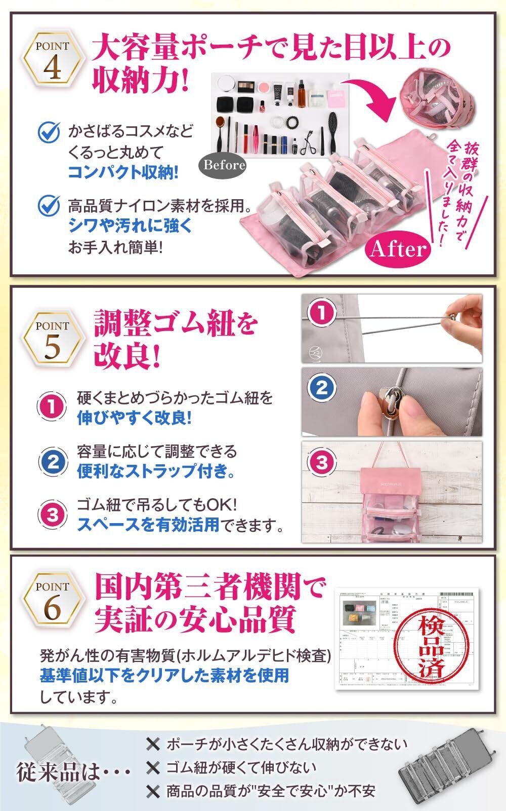 【使いやすさと安心へのこだわり】①4つのポーチはマジックテープで取り外し可能で、1つにコンパクトに収納でき単品でも使用できます。②高品質メッシュ素材を使用することでポーチは通気性が良く、コスメからアメニティグッズまで蒸れずに収納できます。中身が見えるので探す手間もありません。③ストラップはポーチの中身に合わせて調節可能で4つのポーチをしっかり収納できます。④ホルムアルデヒド検査に合格済み。肌に触れる物なので素材の安全性にもこだわりました。