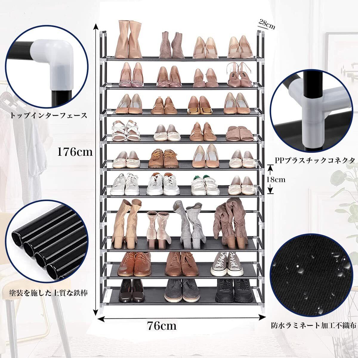 【省スペース 大容量のシューズラック ブラック】サイズ:幅約76×奥行28×高さ176cm,靴ラックは、全10段で、靴を38〜40足収納できます。収納スペースが狭く、靴が多い方に、この靴ラックは非常に好適です。フットプリントが小さいため、靴ラックはスペース効率が非常に高く、すべてのコーナーに適しています。