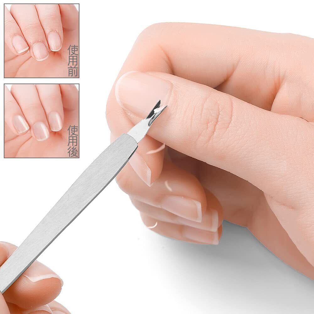 【材質】ステンレス 【パッケージ内容】キューティクルニッパー×1、キューティクルプッシャー×1、キューティクルカッター×1、爪ヤスリ×1。計4点セット。