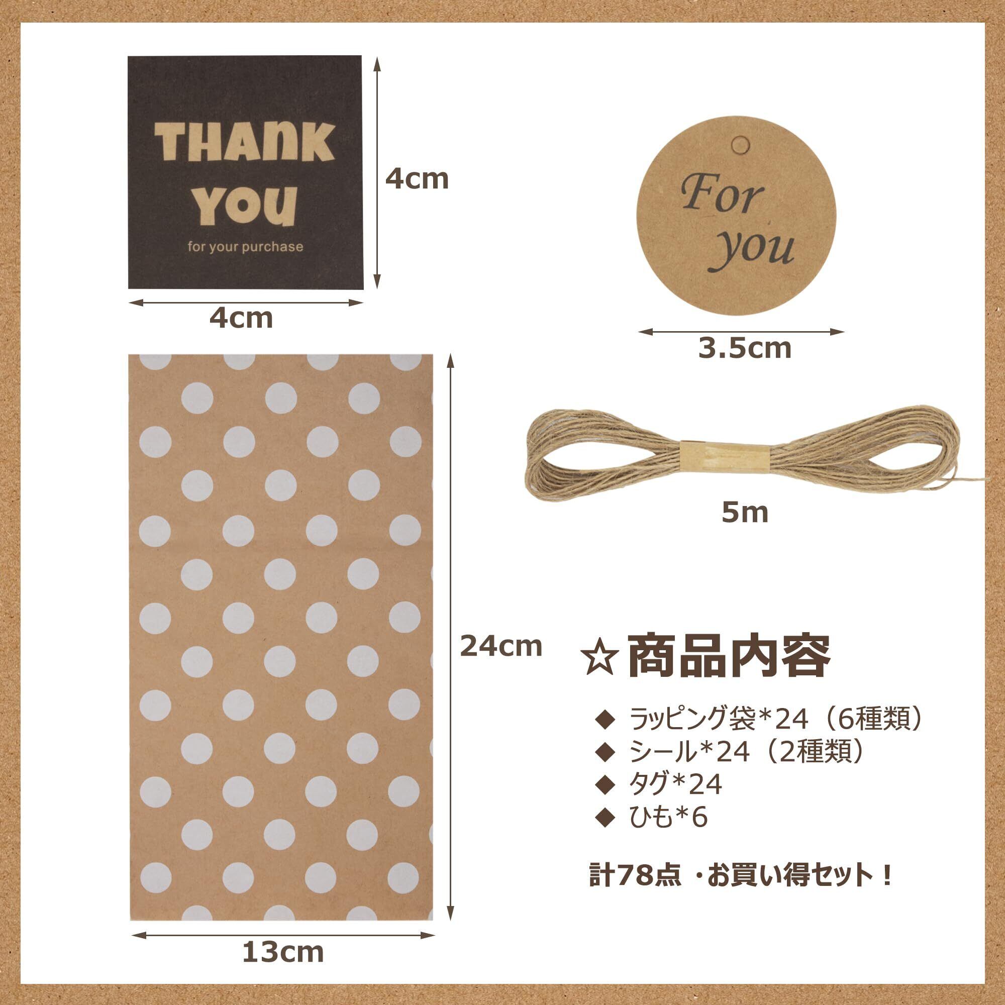 【商品内容】24枚ラッピング袋(6種類):13*24cm 24枚シール(2種類):4*4cm 24枚タグ:3.5cm ひも*6:5m*1mm 合計78点。