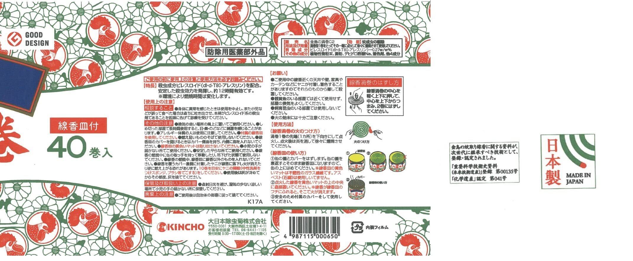 相談すること●身体に異常を感じたときは使用を中止し、また小児などが誤って食べた場合は直ちに吐き出させ、本剤がピレスロイド系の殺虫剤であることを医師に告げて診療を受けてください。その他の注意●換気の良い場所の風上に置いてご使用ください。●しめ切った部屋で長時間使用すると、目・鼻・のどなどに刺激を感じることがあります。●アレルギー体質の人は使用に注意してください。●線香皿のカバーを開けるときはカバー側面を持ち、内側に指を入れないでください。●線香皿の黄色いマットは取り出さないでください。●小児の手が届かない所でご使用ください。●安定した平らな所でご使用ください。●線香の燃焼中に缶の取っ手を持って移動したり、吊下げた状態で使用しないでください。●線香の燃焼中、線香皿に線香以外のものを入れないでください。●線香を覆うカバー裏側に付着したヤニが線香に落下し火が消えたり逆に燃え上がる恐れがあります。10巻を目安にヤニの掃除(中性洗剤をつけスポンジ、ブラシ等でこする)をしてください。●使用後は灰が冷めてからその都度、灰を捨ててください。保管及び取扱い上の注意●直射日光を避け、湿気の少ない涼しい場所で小児の手の届かない所に保管してください。廃棄上の注意●ご使用後は自治体の指導に従って捨ててください。お願い●ご使用中の線香近くの天井や壁、家具やカーテンなどにヤニが付着し着色することがありますのでそれらのものから離して設置してください。●観賞魚のいる部屋では近くで使用せず、部屋の換気をよくしてください。●飼育昆虫のいる部屋では使用しないでください。使用方法(線香渦巻の火のつけ方)渦巻1巻の先端(1ヵ所)を下向きにして点火し、点火後は炎を消して徐々に燻焼させてください。(線香皿の使い方)1缶の蓋とカバーをはずします。缶の蓋を裏返すとそのまま線香皿になりますので、缶の上にはめてください。※線香皿の黄色いマットは不燃性のガラス繊維です。アスベスト(石綿)は使用していません。2点火した線香を黄色いマットの上の中央に直接置いてください。※線香が線香皿のフチにふれると、そこで火が消えます。3安全のため付属のカバーをして使用してください。