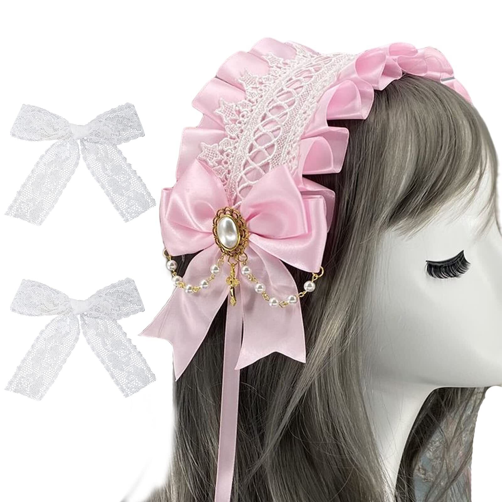 サムコス ロリータ リボン チャーム ロリータ ヘッドドレス ロリータ 髪飾り カチューシャ レース 蝶結び 萌え キュート かわいい コスプレ lolita メイドカフェ (ピンク)