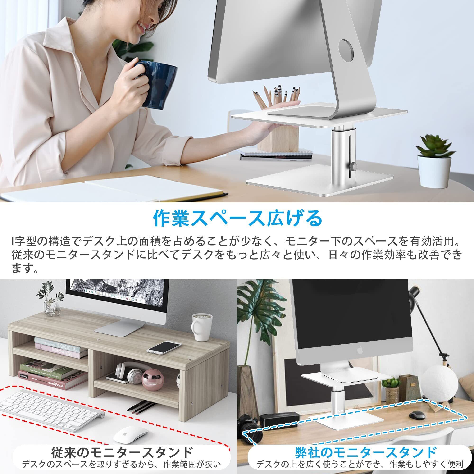 【デスクスペースが有効活用】:従来の4本足のモニター台の前足が邪魔でデスクが狭くなることが解消、「コ」の字型の構造でモニター台の下にキーボードやマウスを設置することもできて、デスクをもっと広々と使い、日々の作業効率も改善できます。