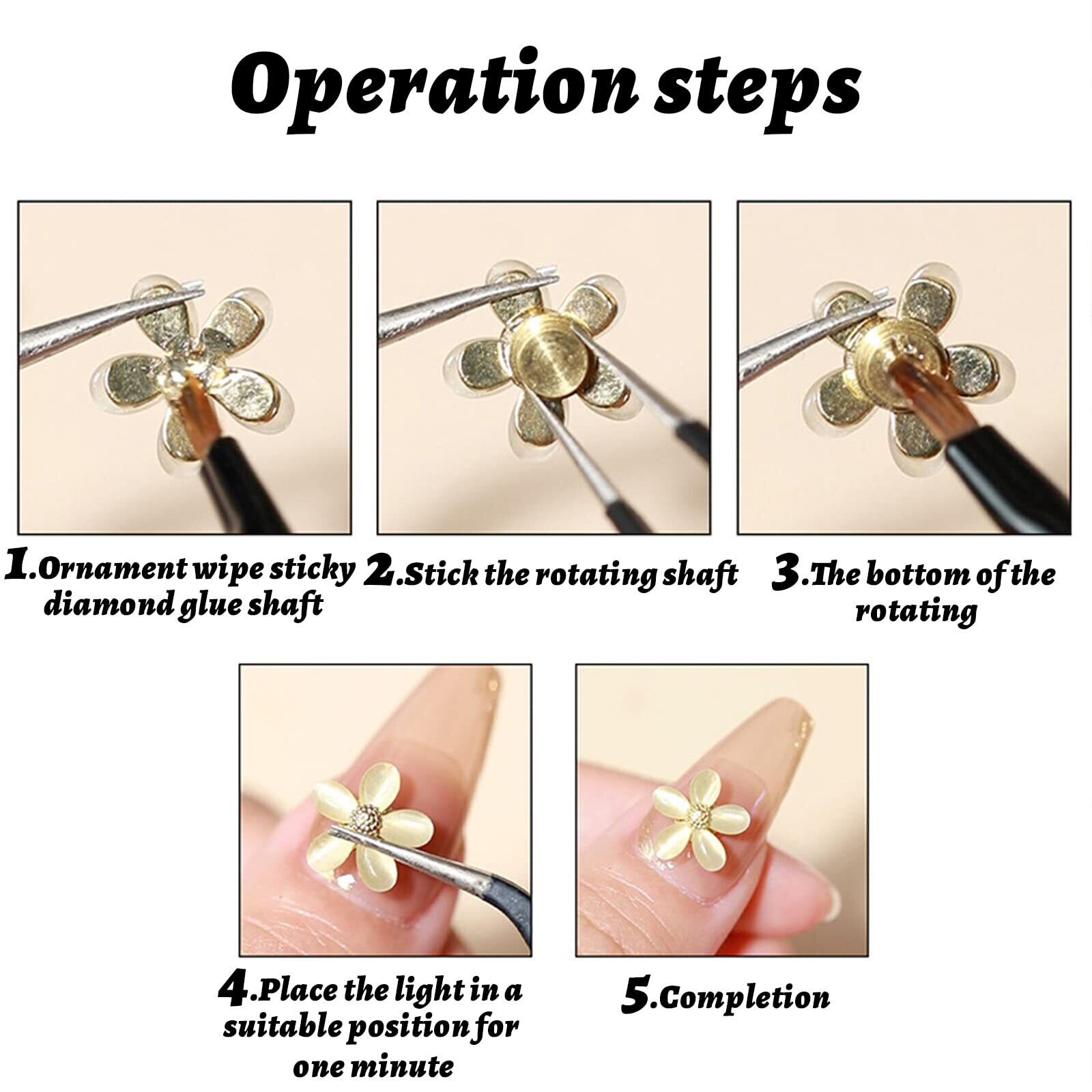【使用方法】まず、リボン、ストーン、花、くまなどの立体的なネイルパーツに接着剤を塗布し、回転台座に付けました。最後に、爪の表面をきれいにした後、ロータリーベアリングをネイルに固定しました。