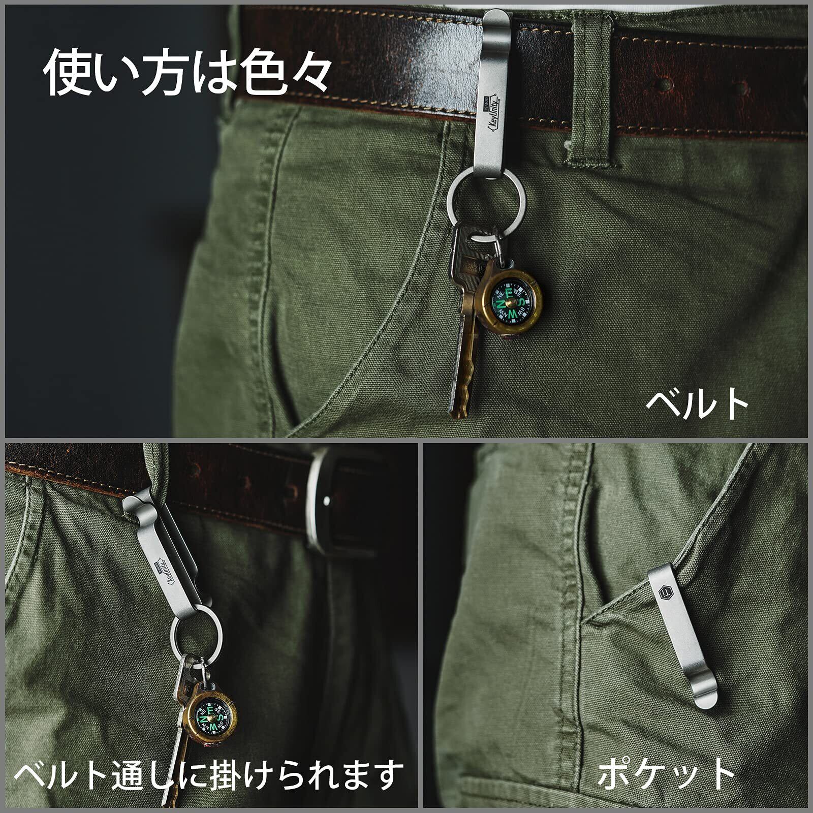 【3wayの使い方】チタンキーホルダーは、「ベルトにかける」、「ベルトループにかける」、「そのままズボンをはさむ」といった3通りの使い方ができます。ベルト、ポケットとリュックサックに掛けやすくなっています。