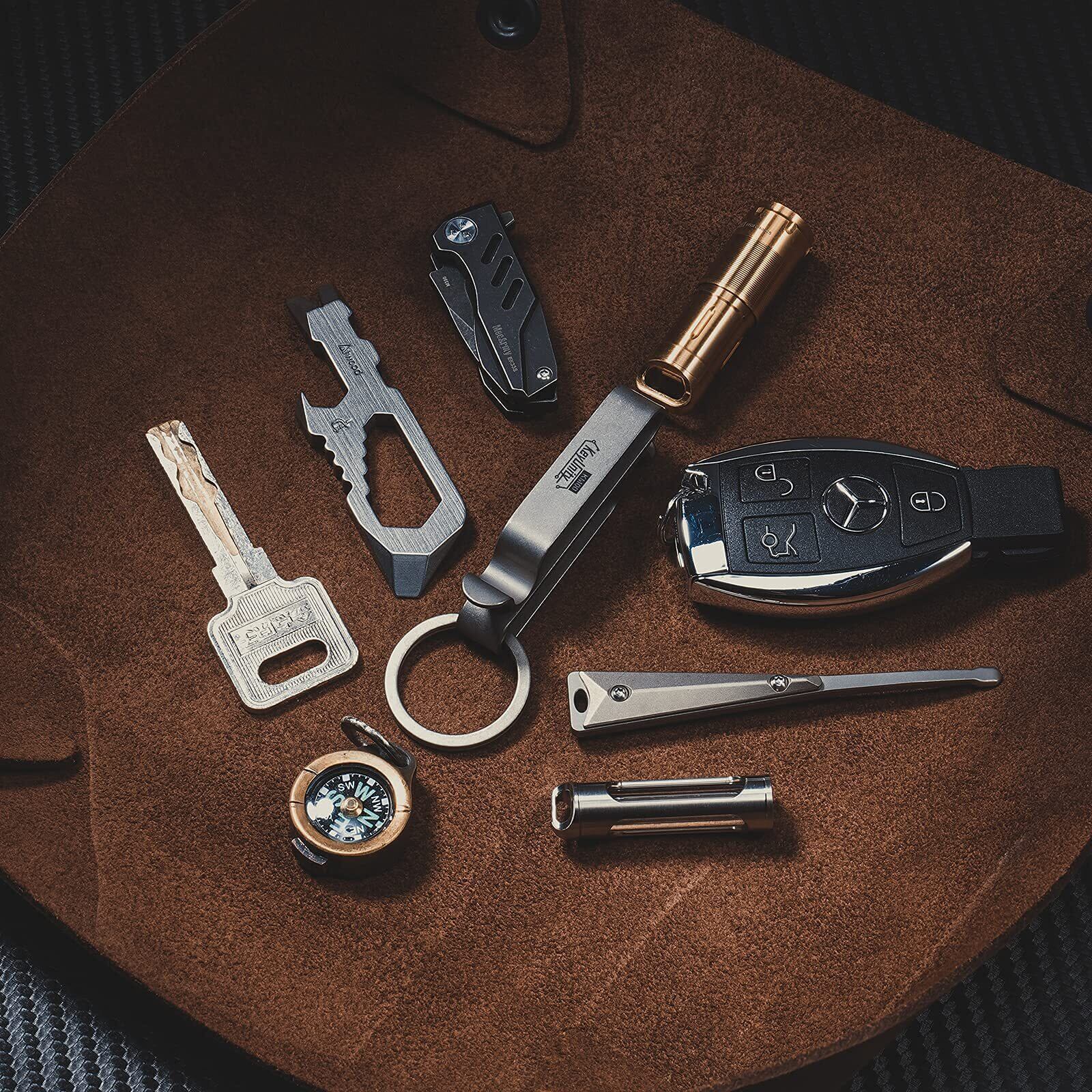 【チタン合金キーホルダー】KM00全部位がチタンでできているためとにかく軽い!キーホルダー本体の長さ58mm,幅10mm,全体の厚さは20mm重さはわずか13gです。また、軽量であることの他に、頑丈・丈夫かつ錆びないという特徴も持っています。チタン合金はシンプルでスタイリッシュな印象を与えます。ミニマル派のメンズにもおすすめです。